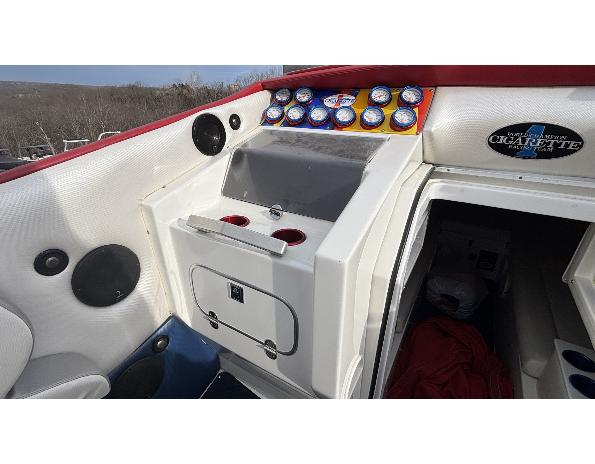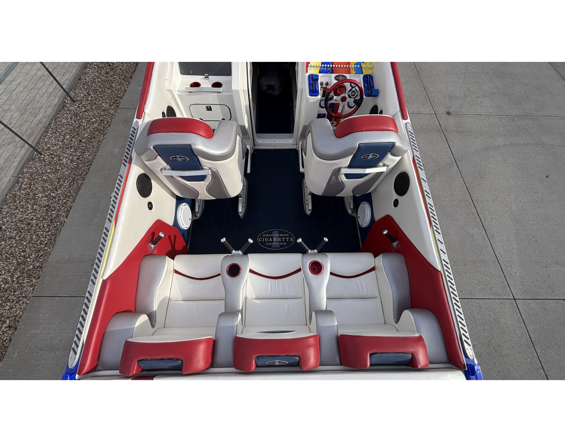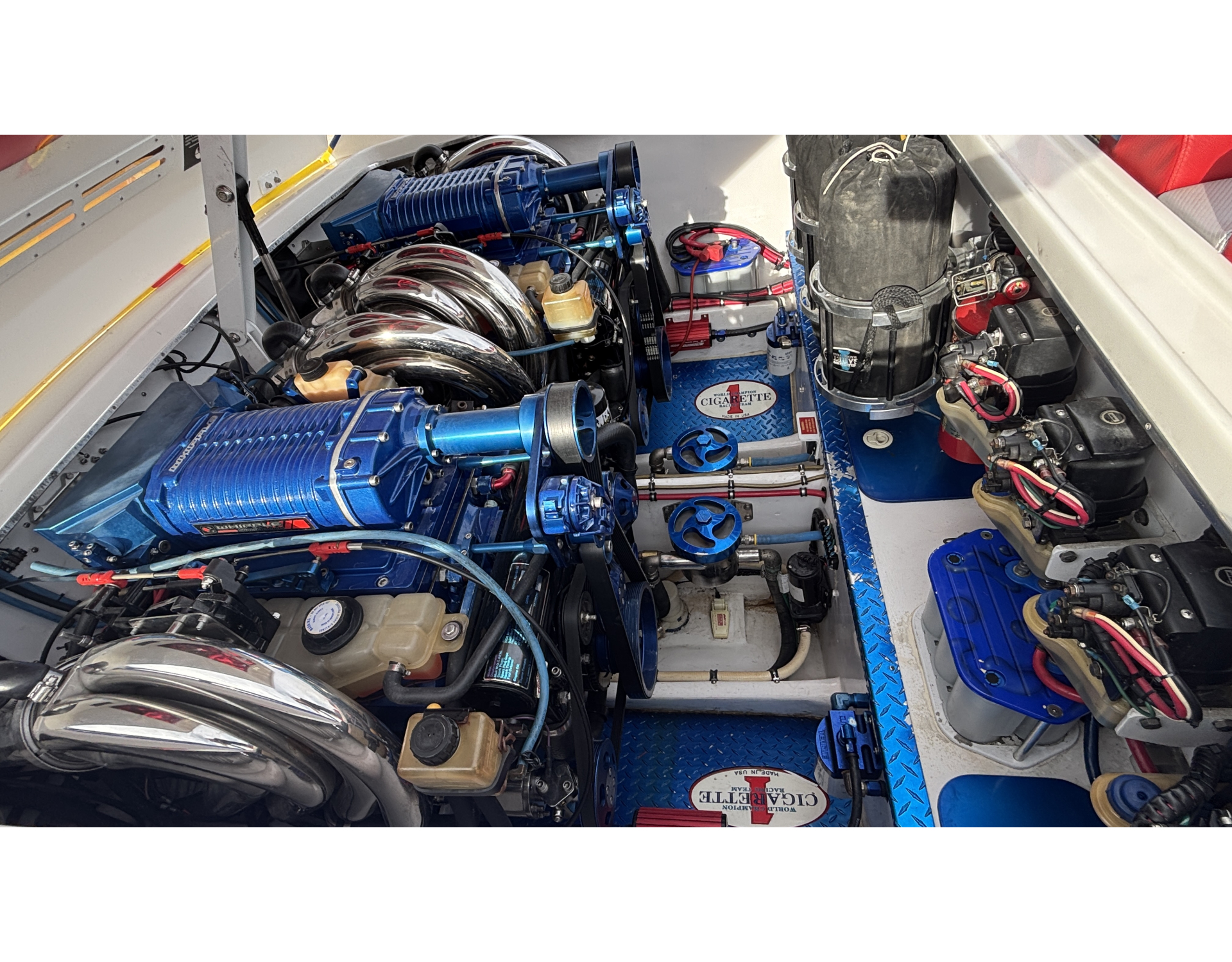 2003 Cigarette Racing 38 Top Gun Twin Step, Mercury Racing 525 EFI with Whipples, (332 hours – 4 hours on engine rebuilds – drives are new), ITS transom assemblies, IMCO SCX drives, 280 K planes, Gaffrig gauges, electric engine hatch, shore power, battery charger, Garmin GPS, upgrade stereo system, cockpit carpet, cockpit cover, Myco triple axel trailer included.