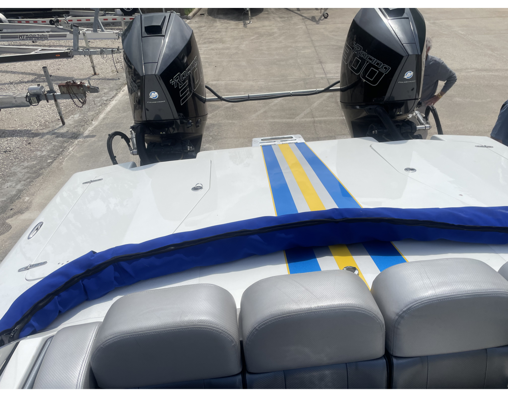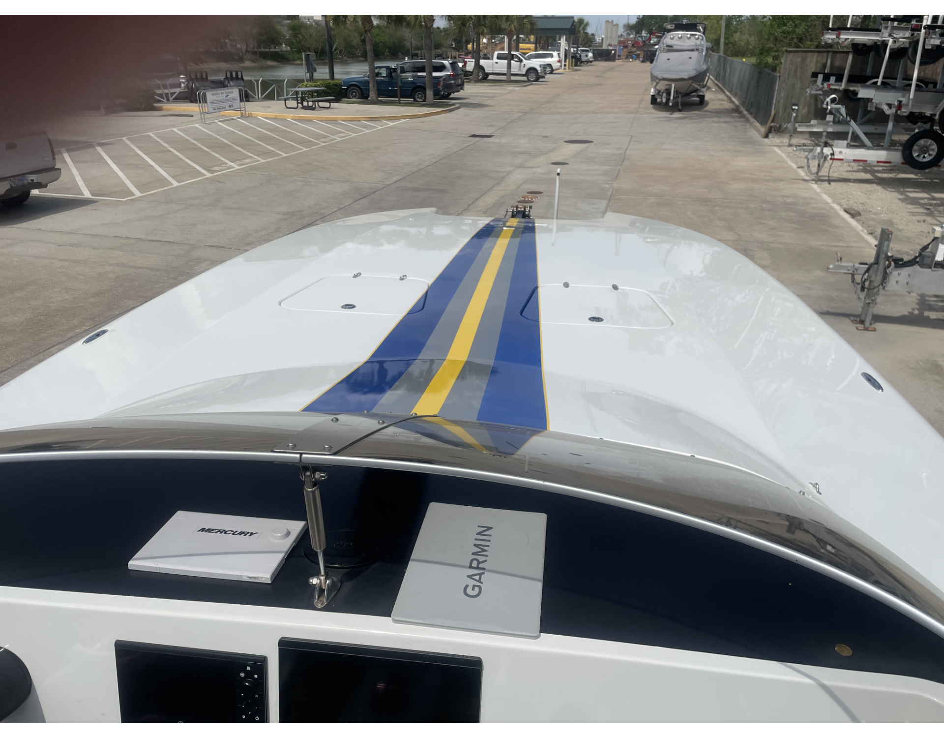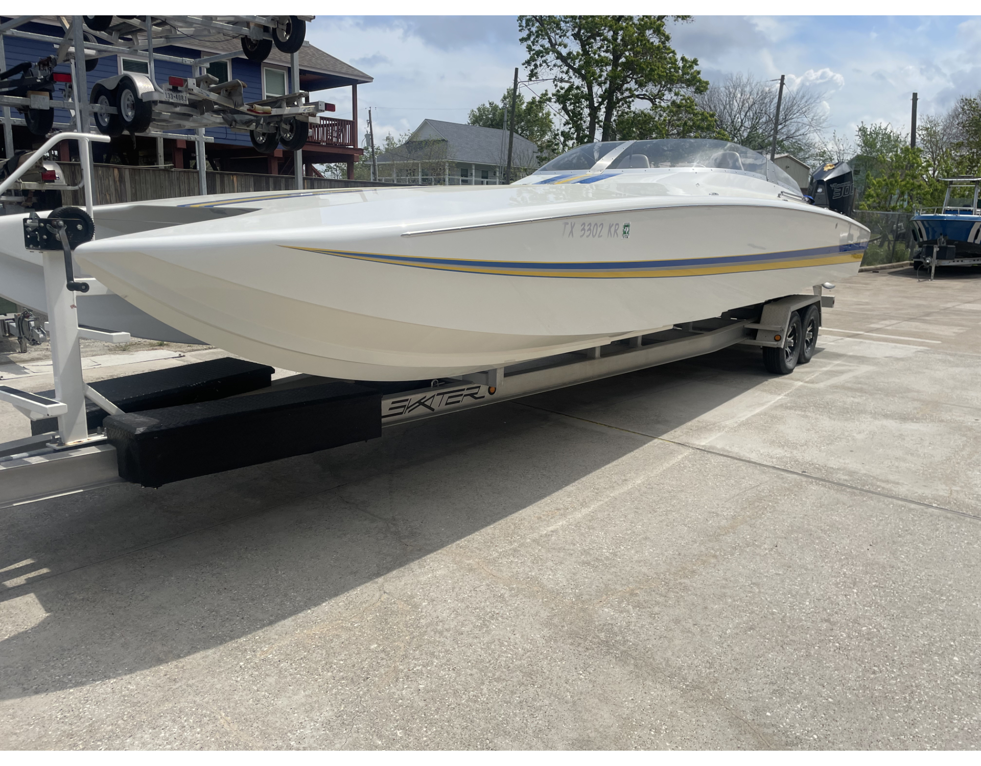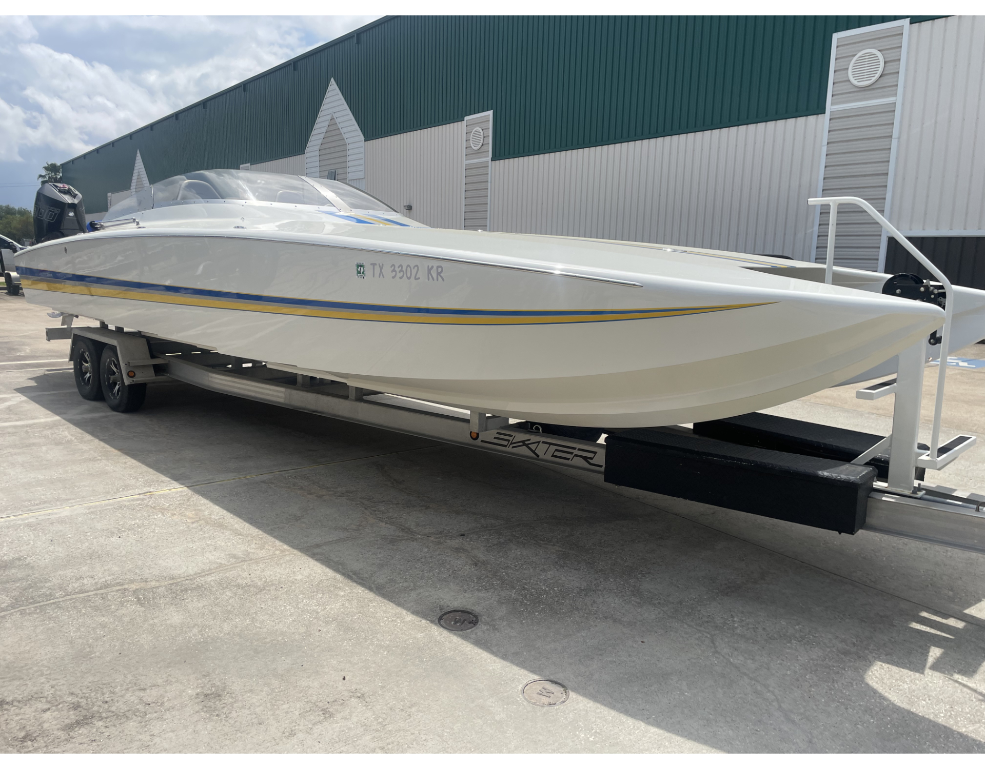 2006 32 Skater-Widened Tunnel 10”-Wrap around windshield —New Paint in 2025–Twin Mercury 2019 300R V8 Outboards—106 hrs on the outboards—-Water pressure equalizer crossover tube—New Garmin GPS—New Vessel View—-Mercury electric Hydraulic steering—Mercury Hi Performance intakes. Hering Props—Battery Charger—New Brakes and Axles on trailer— Tandem axle aluminum trailer