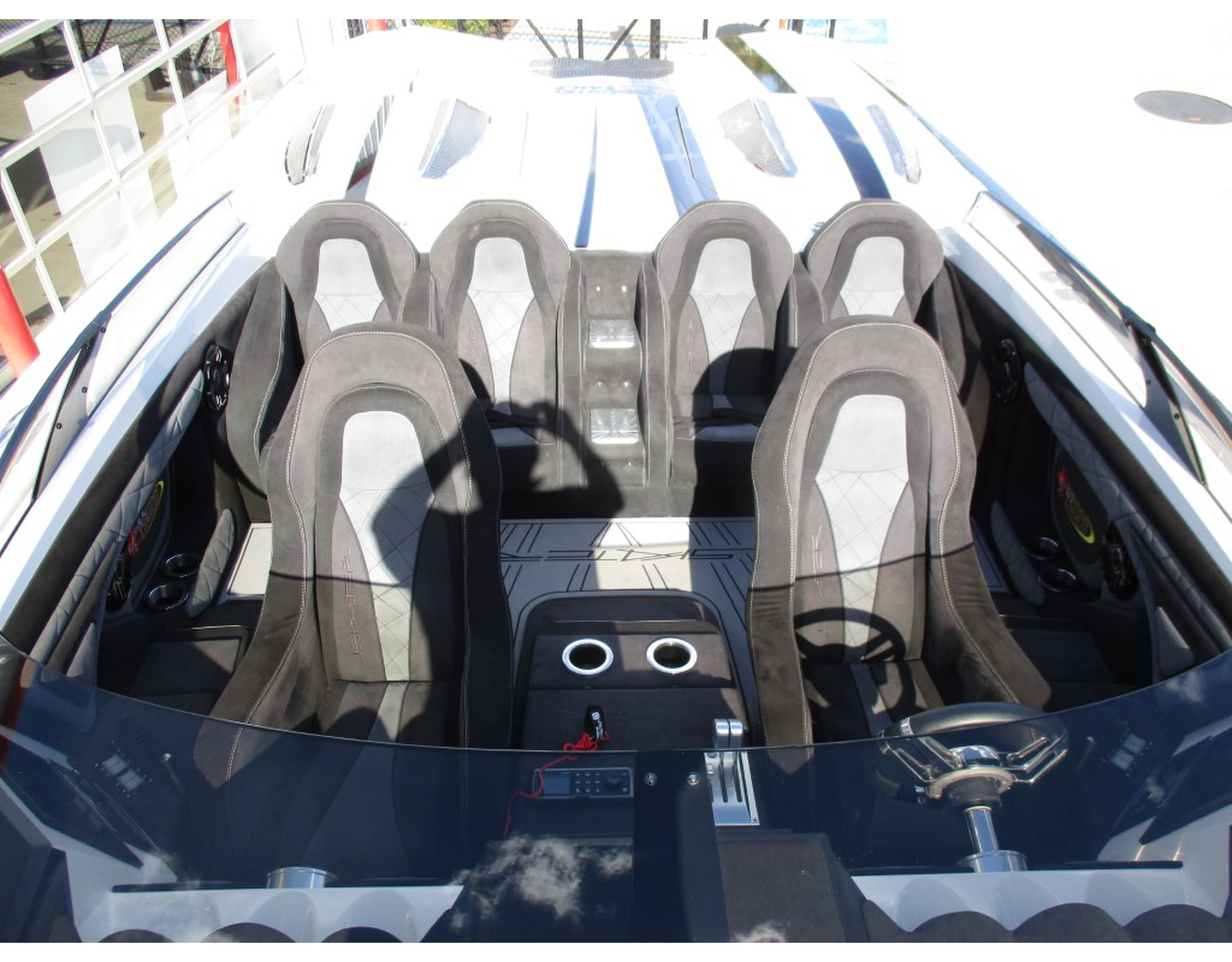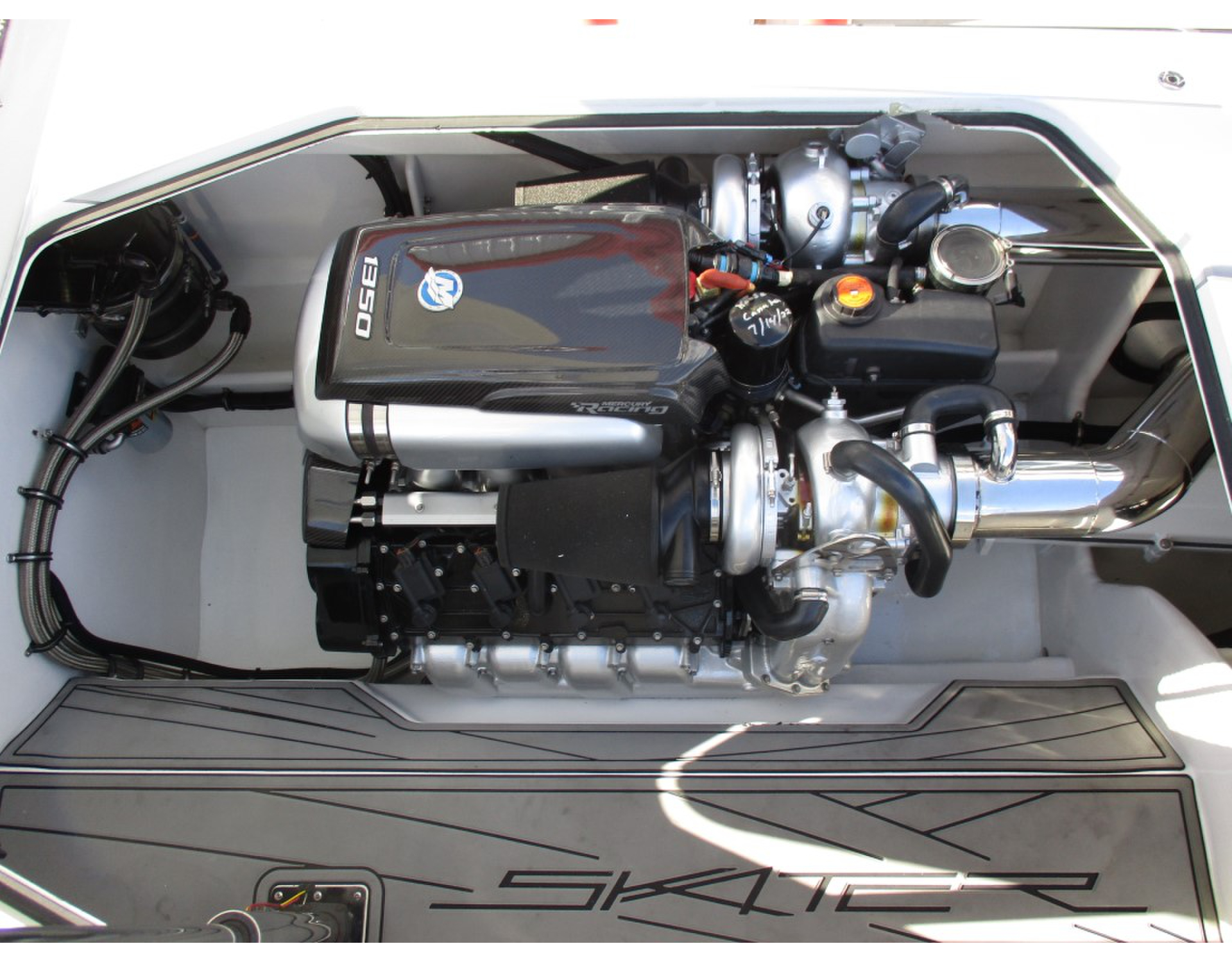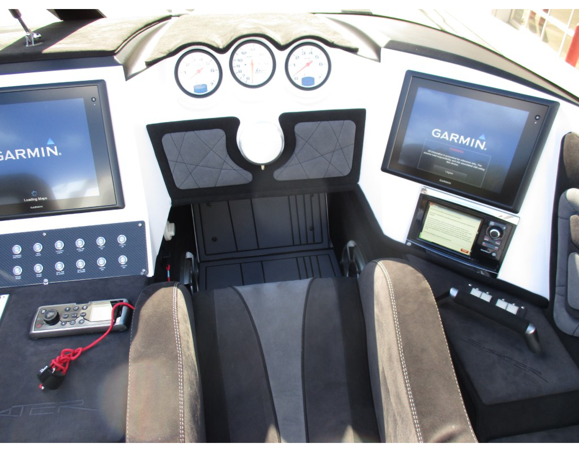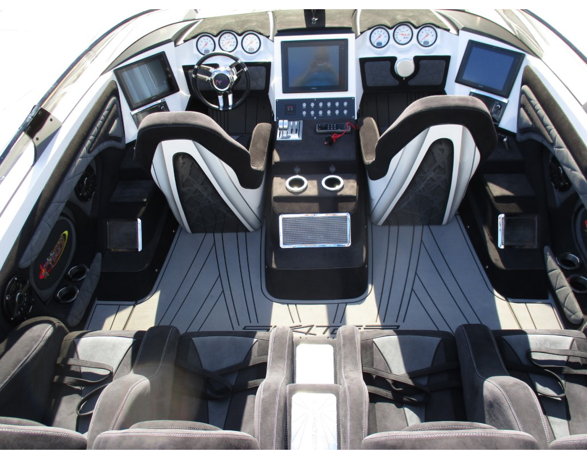 | 2015 Skater 46 powered by twin Mercury Racing QC4V1350s with 68 hours, M8 drives, Garmin 7612 centered in dash, (2) Garmin 7608, (2) Mercury Vessel View 7, Fusion/JL Audio, dual helm, Livorsi Smartcraft analog gauges, GPS speedometer, Sea Deck Flooring, cockpit cover, and Douglas Marine tilt trailer included. Financing and transportation available. |