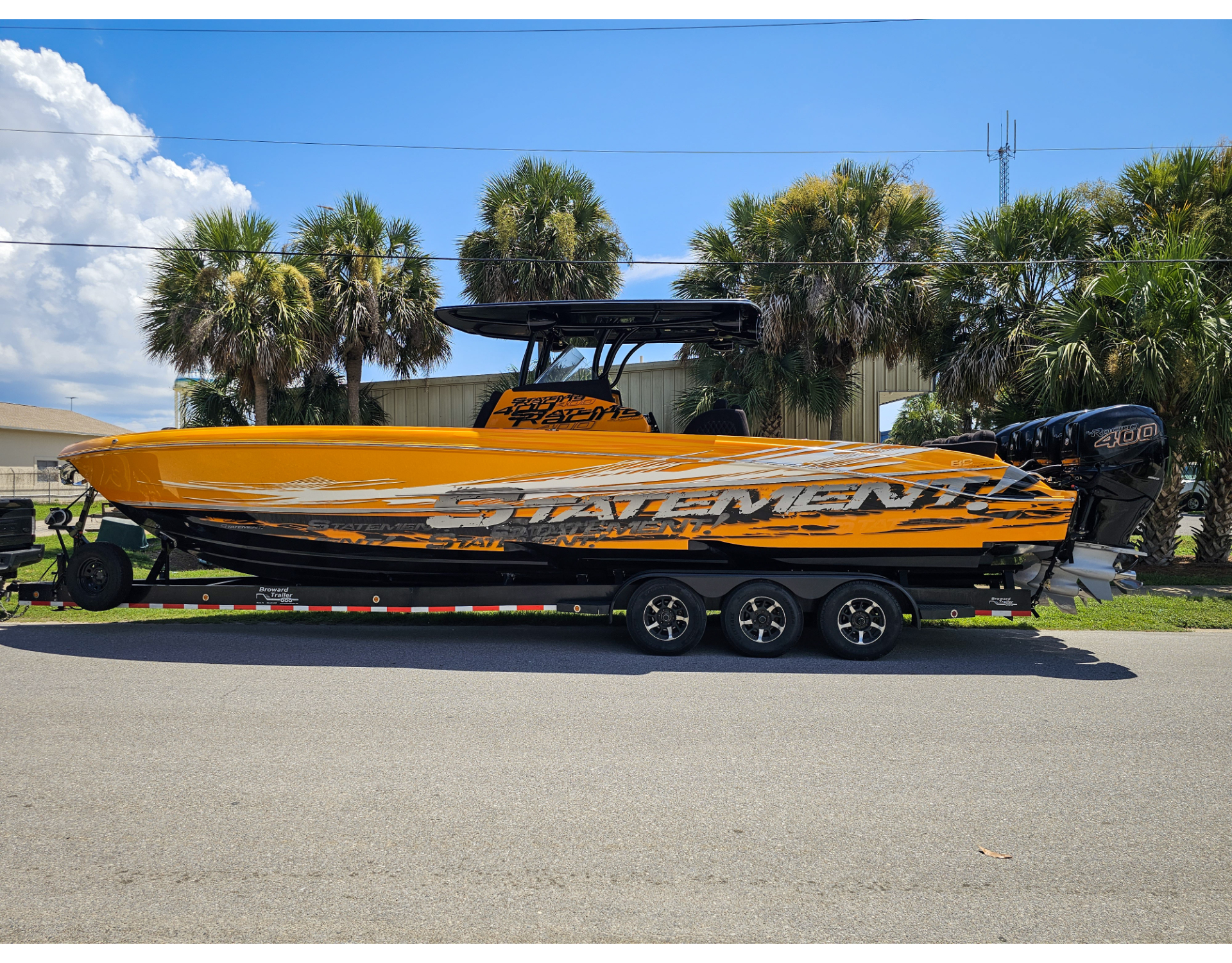 | 2016 Statement 380 powered by quad Mercury Racing 400R (670 hrs). Boat is sitting on a painted Aluminum Broward Trailer with all brand new 14 ply tires plus spare, new bearings, and new brakes.