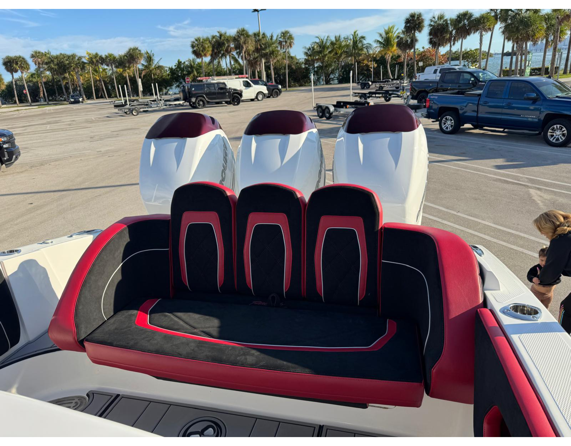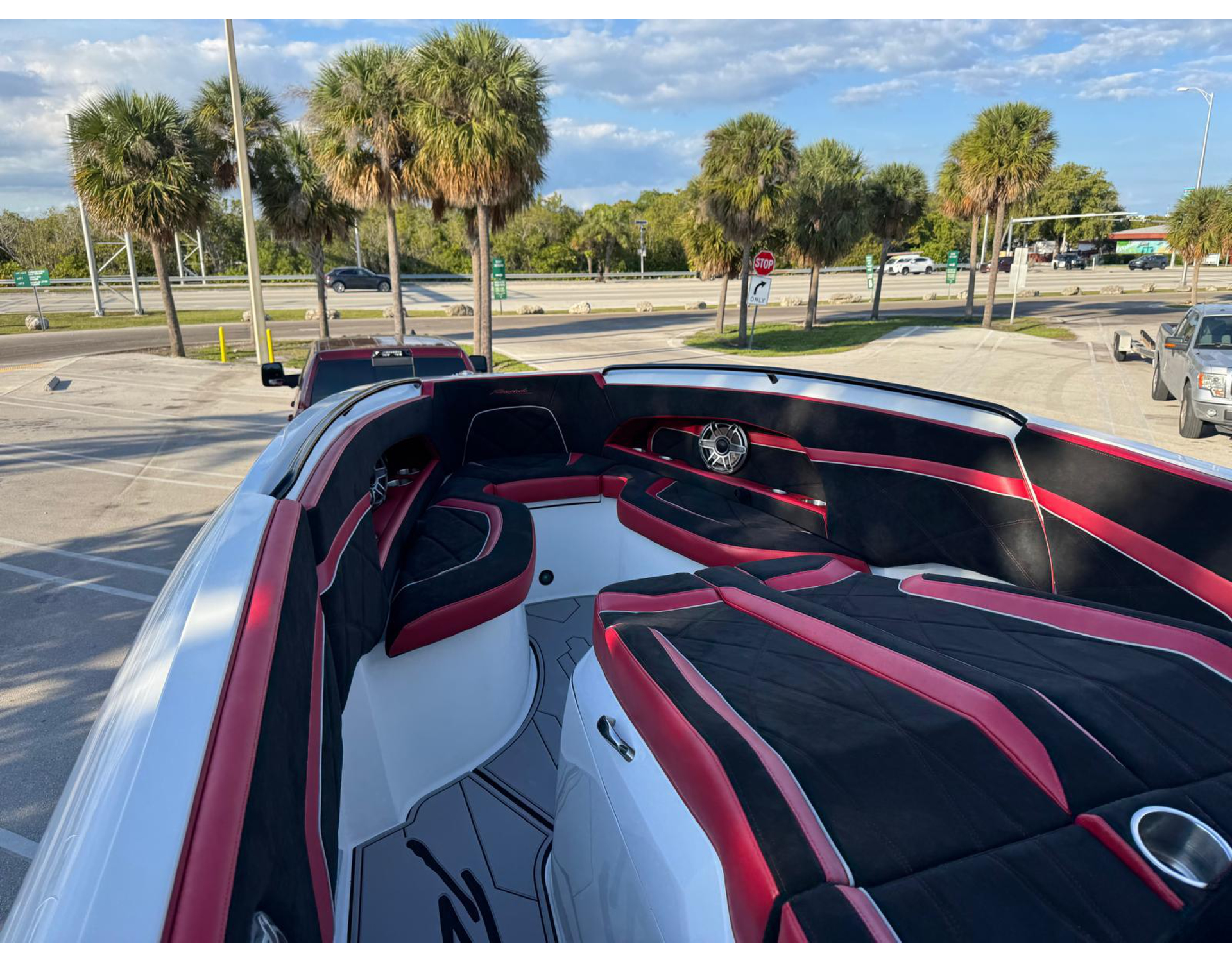 - Gussi Italia Steering Wheel - Twin Garmin 16" GPS Screens - NMEA Gateway 2000 - VHF Radio - Lumitec Lighting - Garmin Transducer - Custom Burgundy Paint Job - Sports Package Complete Upholstery and Dash Pad - Built-In Bow Cup Holder Compartments - Livorsi Trim Tabs with Indicator - Windlass System with Anchor and Stainless Steel Guard Plate - Dual Trumphet Horn - Battery Charger - Shore Power - Stainless Steel Insert w/ White Rub Rail - Rod/Cupholders (2) - Batteries - Full Boat and Engine Covers - AC in Cabin