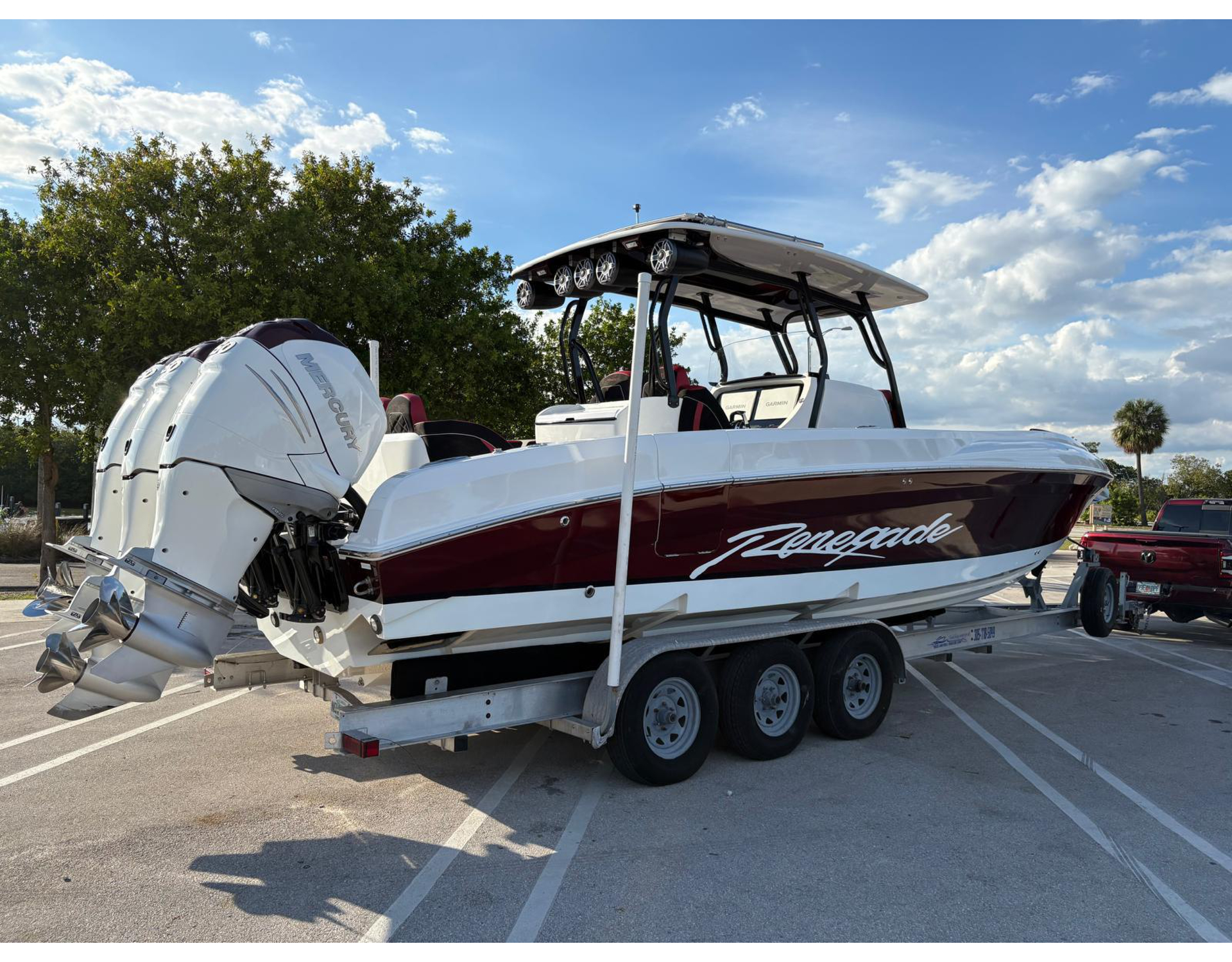 2021 33' Open Renegade - 300 Hours - Good Condition- Brand New Upholstery-Brand New Flooring- Brand New JL Audio Sound System Installed- Sureshade System Mounted on Hardtop- Custom Bar Station with Pull-Out Cooler- Triple Mercury 300 hp Racing Engines/White- Fiberglass Hardtop- Mercury DTS Control