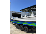 Custom Marine Sales “BLACKOUT PACKAGE”, all black stainless hardware including the controls, latches, rub-rail, transom bracket, anchor, and all grab handles. This boat is loaded up and has all the in-demand options like club sport seating, forward facing backrests, second row seating, 22 inch Garmin GPS's, FLIR, Radar, VHF Radio, big stereo, zero-effort controls, fresh water flush, hexagon interior, PermaTeek flooring, bow thruster, black gel coat bottom, two sets of LED underwater lights, LED hardtop Light bar, and much more…