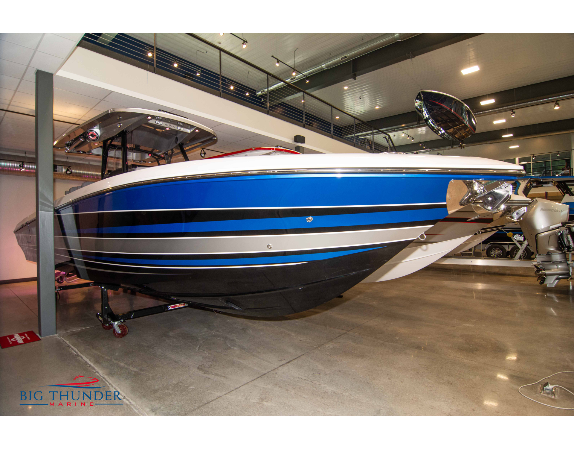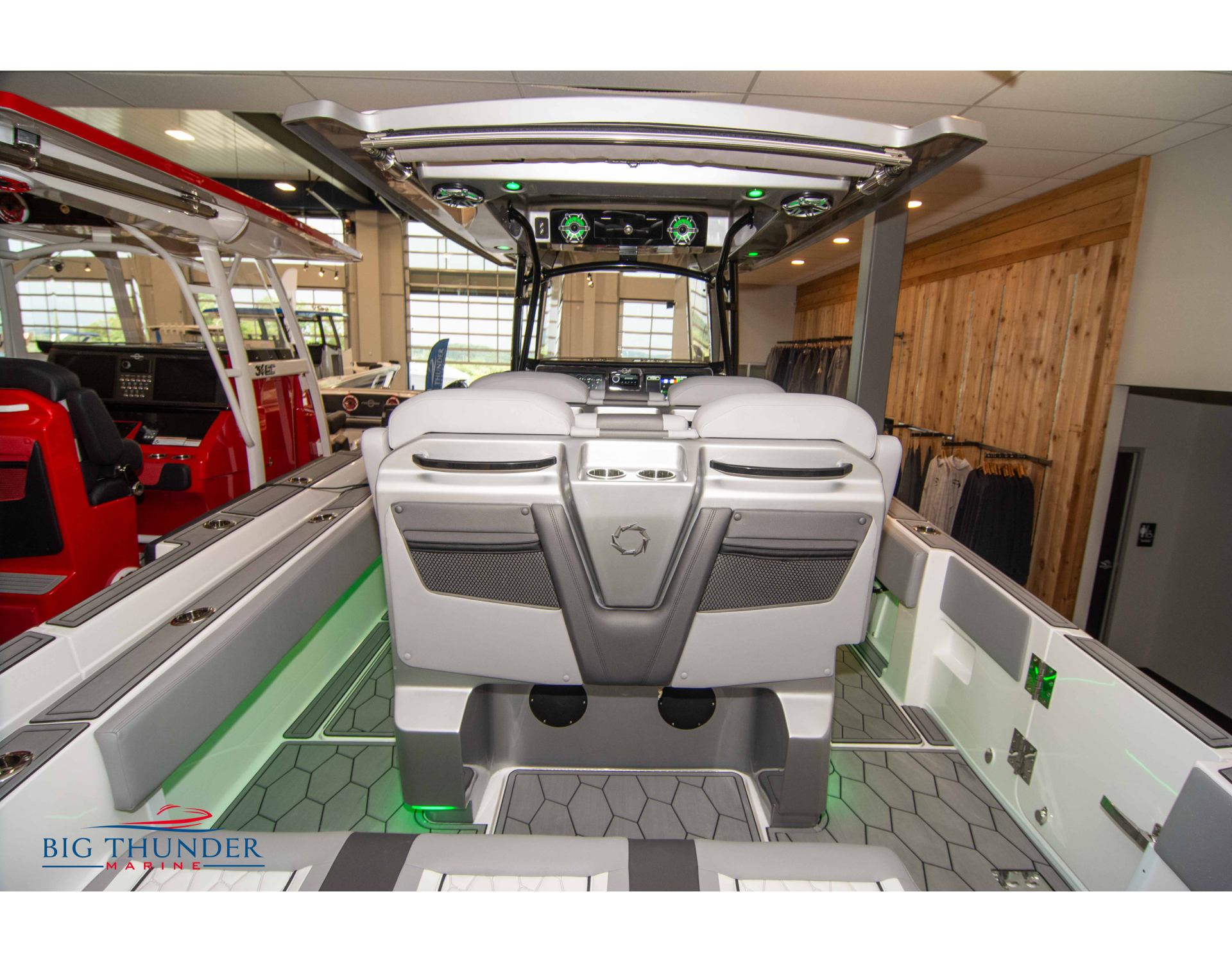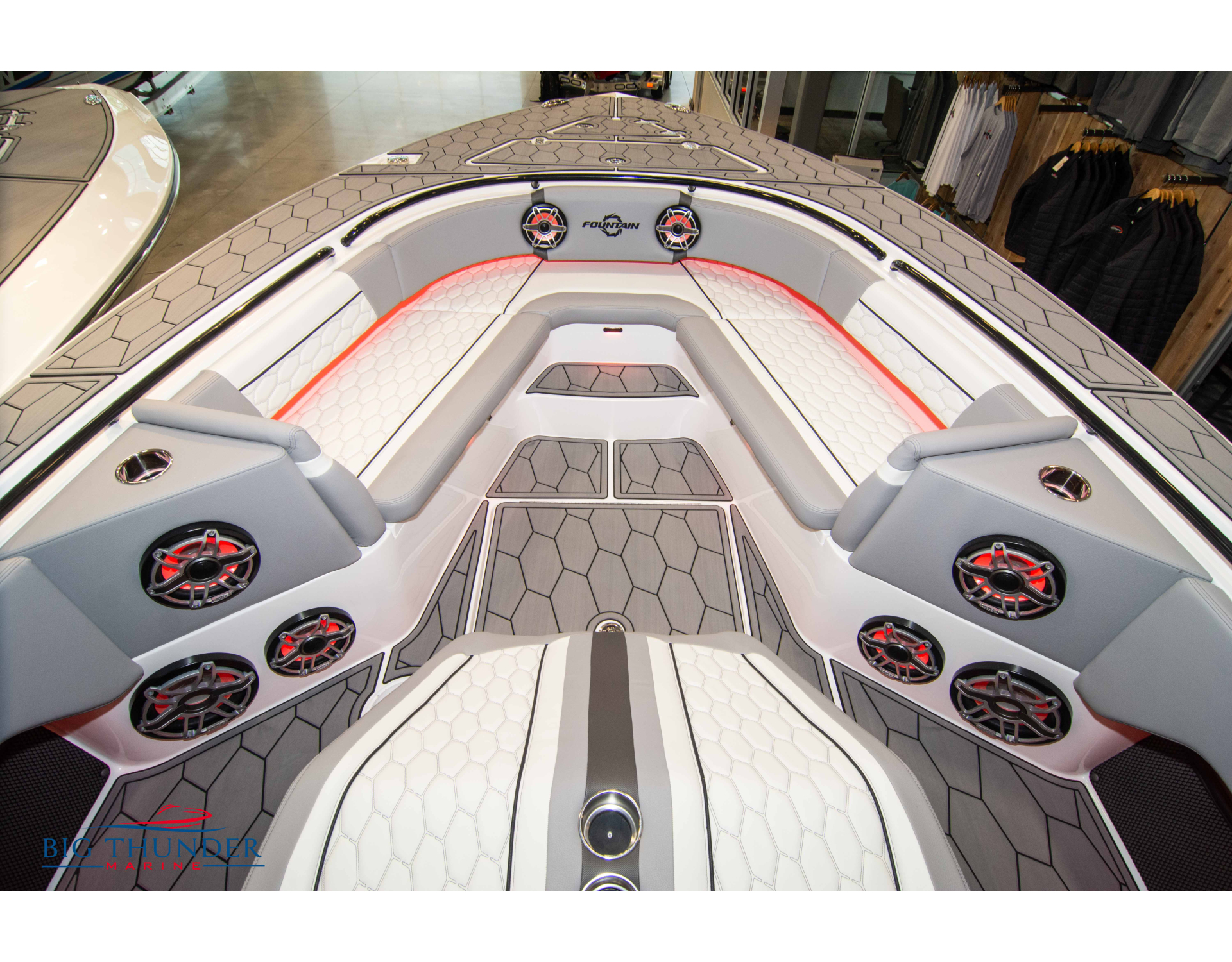 | 2023 Fountain 34 SC Twin Mercury 400M Verado's (Clean Silver Metallic). DTS controls. Mercury 380 K-Planes. Reverso automatic engine flushing system. Custom paint & graphics. Paint matched hardtop, console & dash area. Gloss Black powder coating. Light Gray Cool Touch upholstery w/ Black Cool Touch piping, Charcoal Diamante accents, White Alpha quilted panels, Black stitching & embroidered logos. Slate Gray/Black hex pattern marine mat flooring. Bow thruster. Hydraulic steering. Shadow-Caster RGB LED interior/exterior lighting control system. Dual Garmin GPSmap 8616 16" multi-function displays. Mercury VesselView 903 display. Airmar B60 transducer. Fusion RA 770 touch screen entertainment center w/ built in Wi-Fi. JL Audio speaker system w/ (2) 8.8" LED spkrs., (4) 7.7" LED spkrs., (4) 6.5" LED spkrs., (4) 10" LED subs, (2) 600W 6 ch amps, (2) 600W mono block amps, & (6) additional coaxial spkrs. w/ supporting amp system. Wireless stereo remote. Double row stand up bolsters w/ (2) additional subs. Additional USB outlets in dash & console topper glove compartment. Stitched black leather wrapped steering wheel. Electric SureShade. Starboard side dive door w/ ladder. Enclosed head w/ ceramic toilet, overboard discharge, fresh water/raw water & holding tank, fresh water sink. Screened portlight. Fresh & raw water wash downs. Transom shower. Anchor windlass w/ thru hull striker plate, polished stainless steel plow, 15' of 5/16" galvanized chain & 150' of 5/8" 8-strand braided rope. Battery charging system. New trailer quotes available separate. Financing, insurance and delivery options also available, all 2005 and newer model year trades considered. Call for special dealer pricing and demo scheduling.