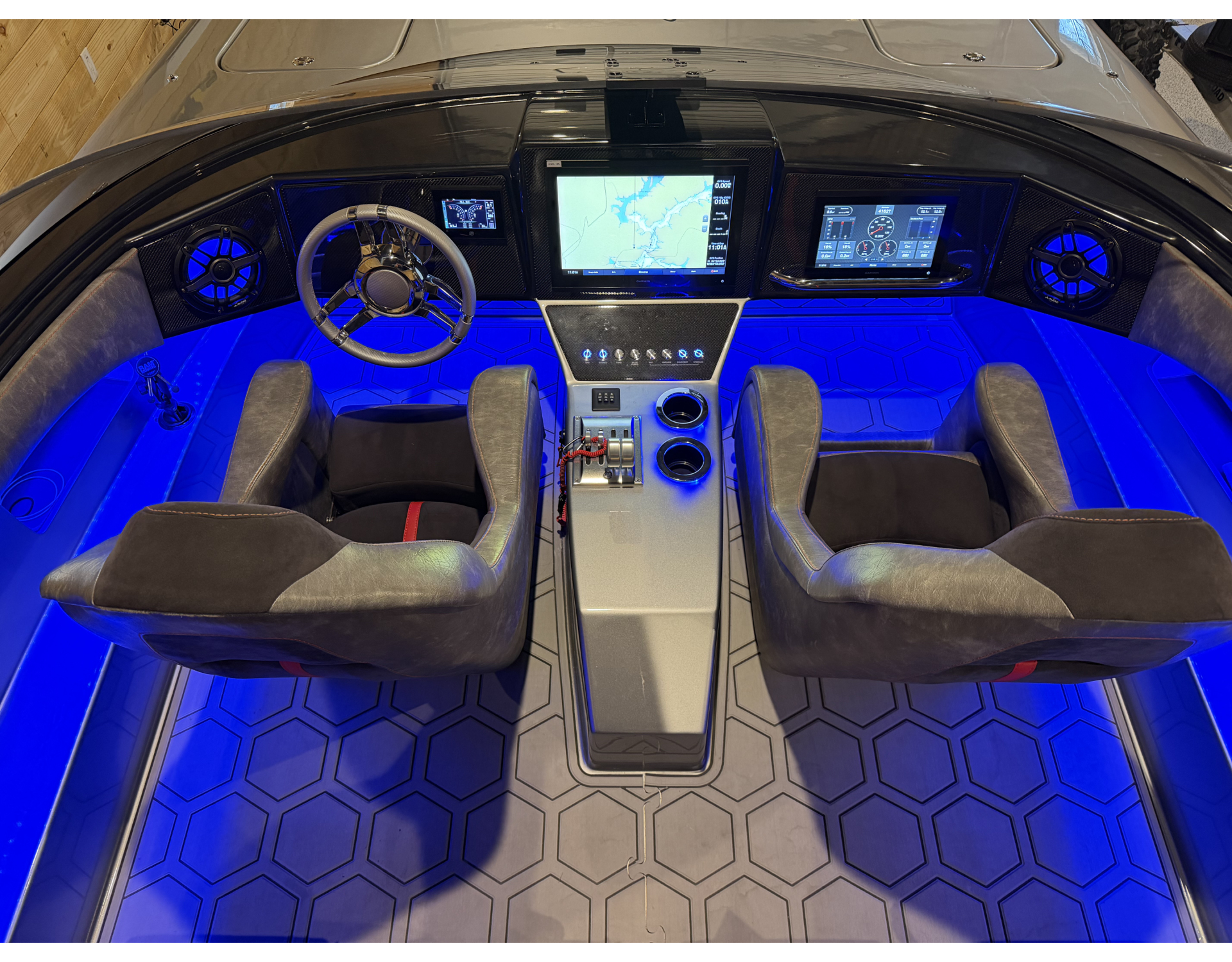 Electronic and audio are top-tier, featuring dual mercury vessel view displays, Garmin, GPS mapping and a JL audio MV 1000/5I sound system. Additional feature include-