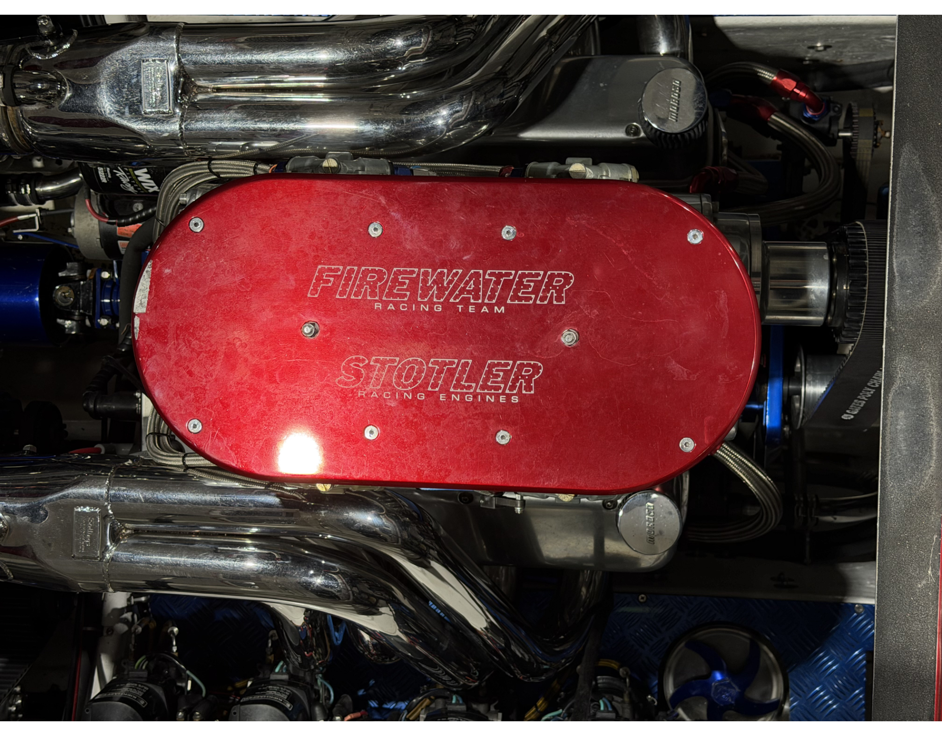 Aluminum water block Crankshaft Sonny Bryant Billet Internal balance / 4.625 Con Rods Oliver Billet / 3.5 bolt upgrade Pistons JE Inverted dome 4.53 Wrist pins Precision Pin Coated Piston Rings Seal power Moly - Cast -LT Cam Timming Kieth black Gear Drive Oil Pan Steff Single stage / steel Harmonic balancer ATI Duel keyway ,zero bal Fly Wheel Innovation Billet steel Drive plate Innovation HD 1000 Cylinder heads Dart Big M Polished Aluminum Valves Manley SS int, Inconell ex Valve train Jessel Shaft rockers Cam Crane SR 262/374-2S1-14 IG (.636 lift) Lifters Crane Roller Intake manifold Hogan Custom sheet metal Ignition system MSD Dual ignition Fuel Pump Aeromotive Electric Alternator Arco 110 Amp Oil pump Auto verti 1 Stage external Oil cooler Hardin Dual 13 plate bell housing Water pump Hardin 3 Stage Transmission Bourg Warner (2) Mercury crash box (1) Exhaust system Stellings Custom stainless tube Super chargers BDS 16-71 stage III / billet rotors, teflon striped Carburator Holley 1050 CFM (Dual)