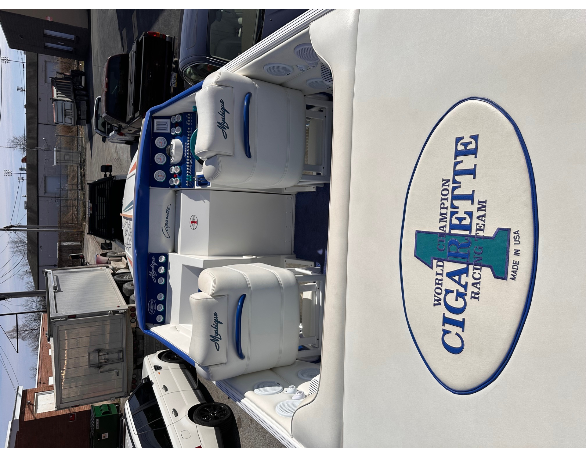 2001 Cigarette Mystique 30ft 30th Anniversary Edition. Twin Mercury 377 scorpion blue engines 380 HP per engine. Mercury racing bravo XR ITS outdrives. 2025 Phoenix custom trailer. Fresh water used only.