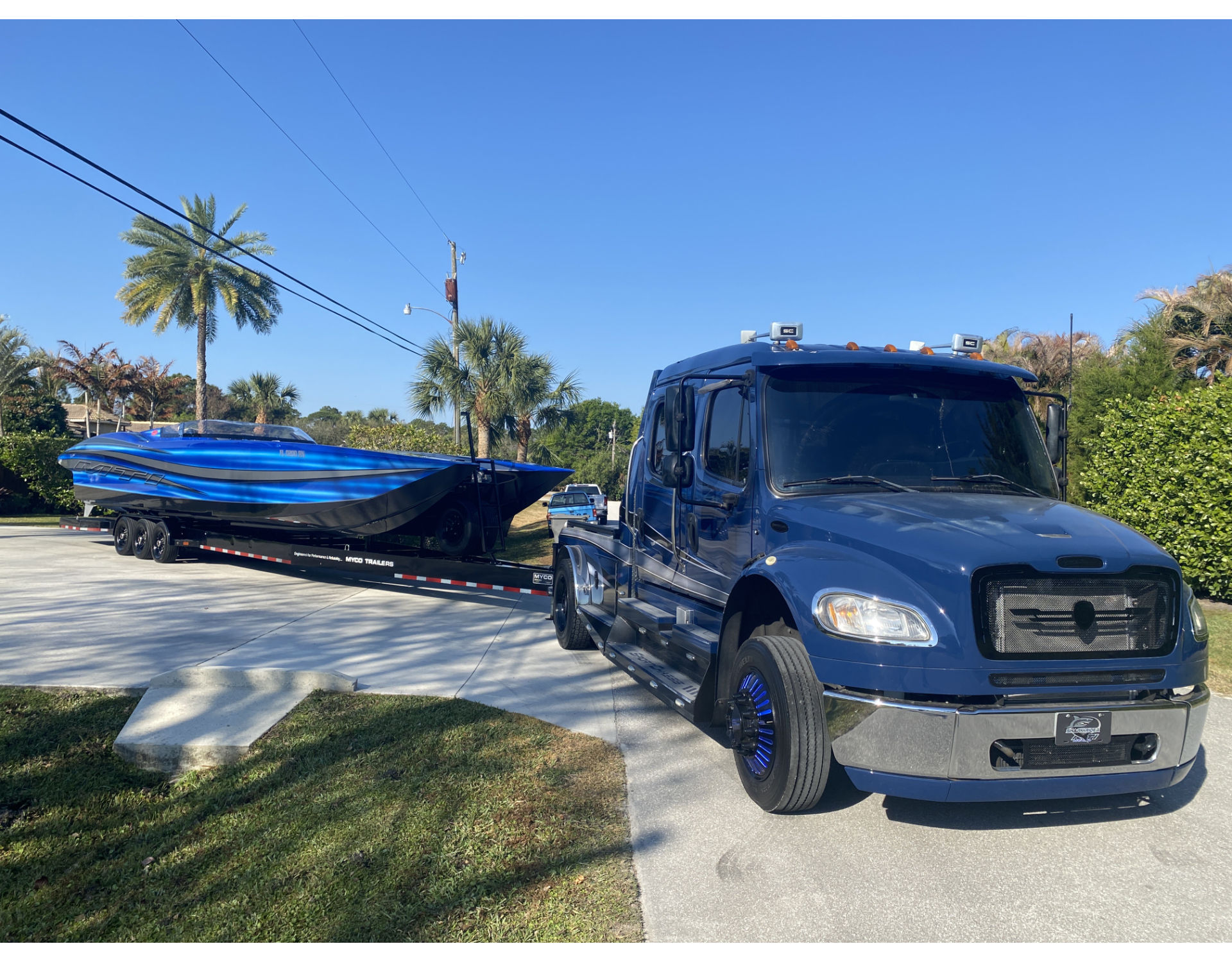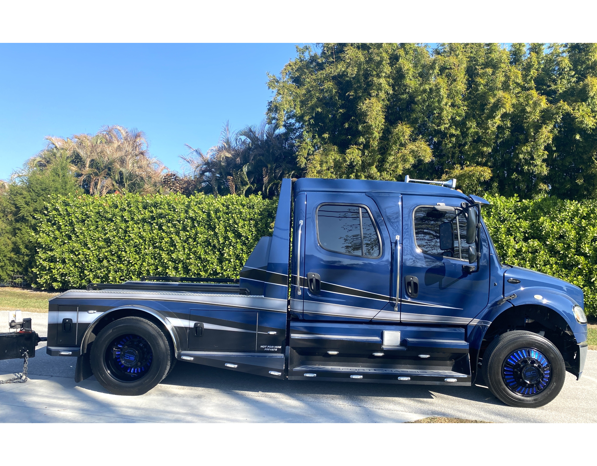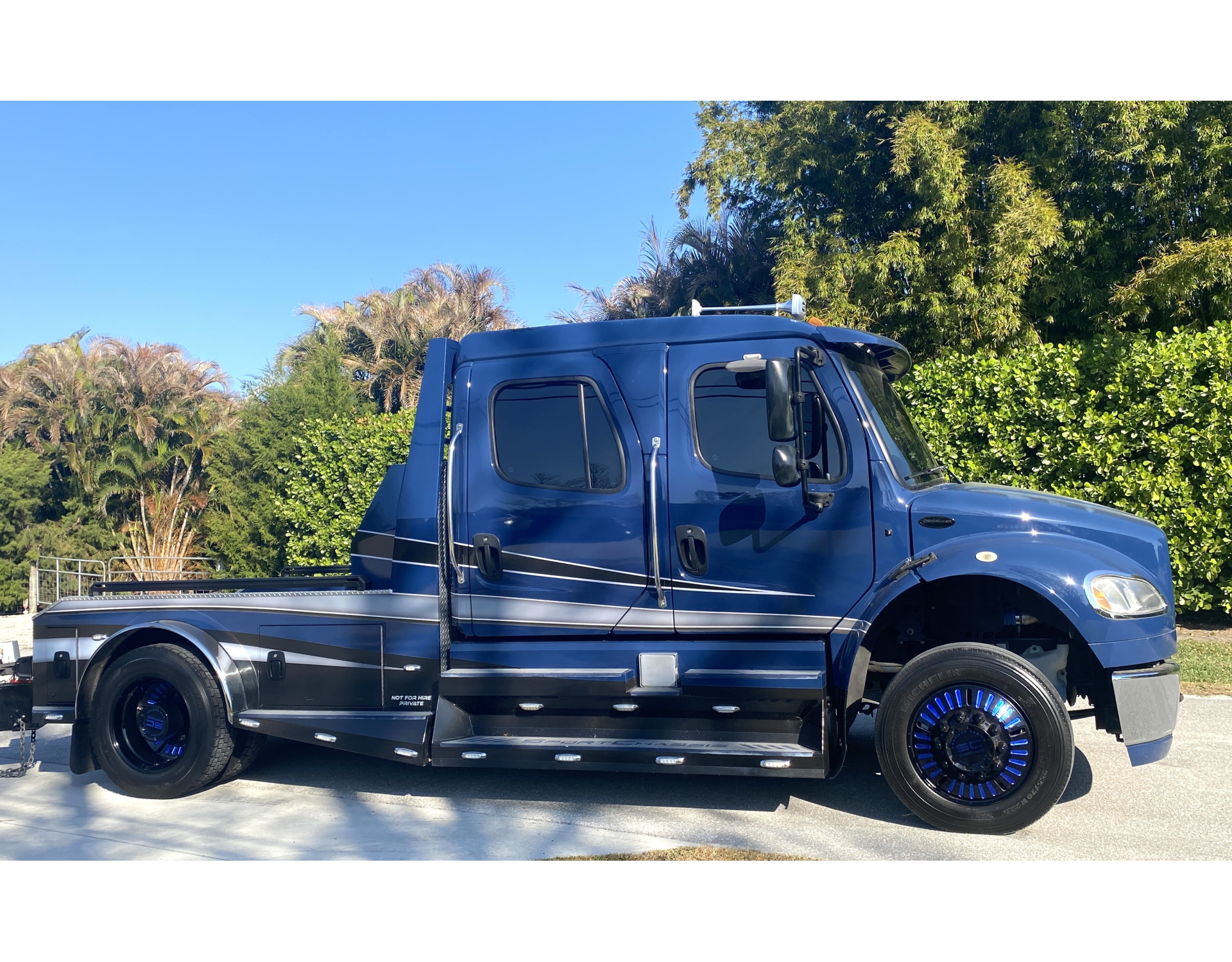 | 2016 Freightliner, Chassis Converted by Sportchassis 8/2020. Cummins 8.3 Engine with Allison Auto Trans, Upgraded Adjustable rear Hitch, Gooseneck hitch under cover in bed, Storage box on bed with prop storage rack, Seadek on bed and steps, Vinyl graphics, Upgraded wheels with blue accents, Blue down lighting, Very Low miles @17,000, Sportchassis interior buildout with rear seat/bed. Traction tires on rear. Hydraulic Brakes, truck can be registered under 26,000 lbs if you don't have a CDL. Graphics match 44 MTI also listed for sale @ PBC. Located off site in SE FL. Appointment required. |