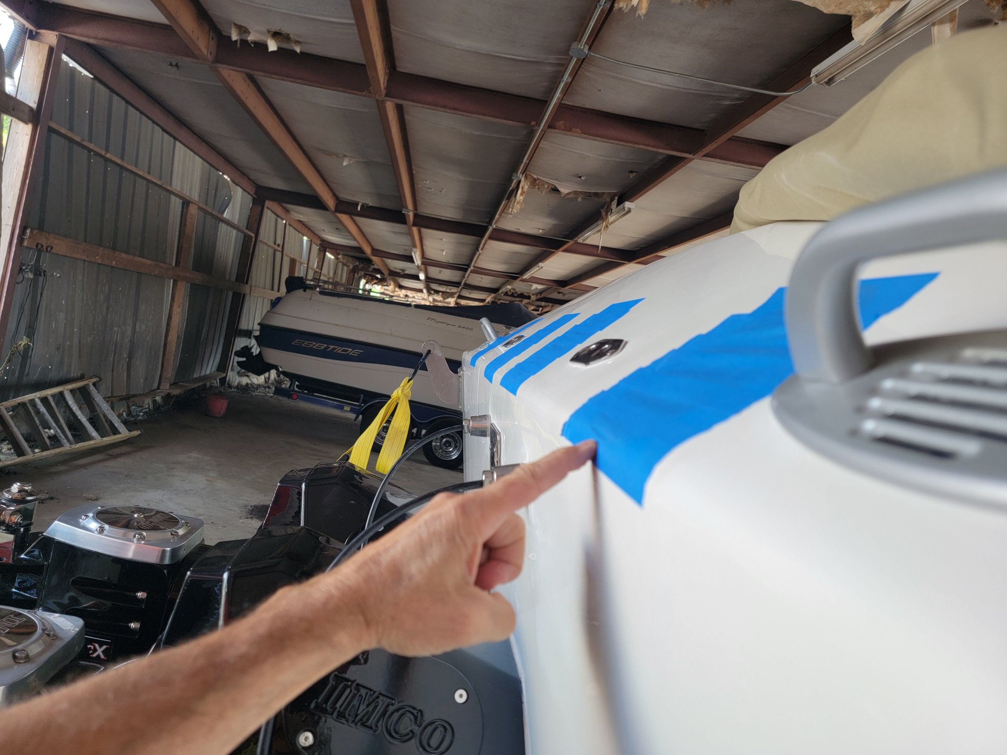 I'll post up some pics of the marine decking I used. I'm not big on a lot of graphics but the boat was seriously plain jane. Also the walk around is narrow and I'm sure it is only a mater of time before I take a swim. I decided to put down some light gray matting and help jazz it up some with a more up to date look. I had an idea to break up the deck from the hull sides with a broken line like you would see from a graphic on an old Mopar. |