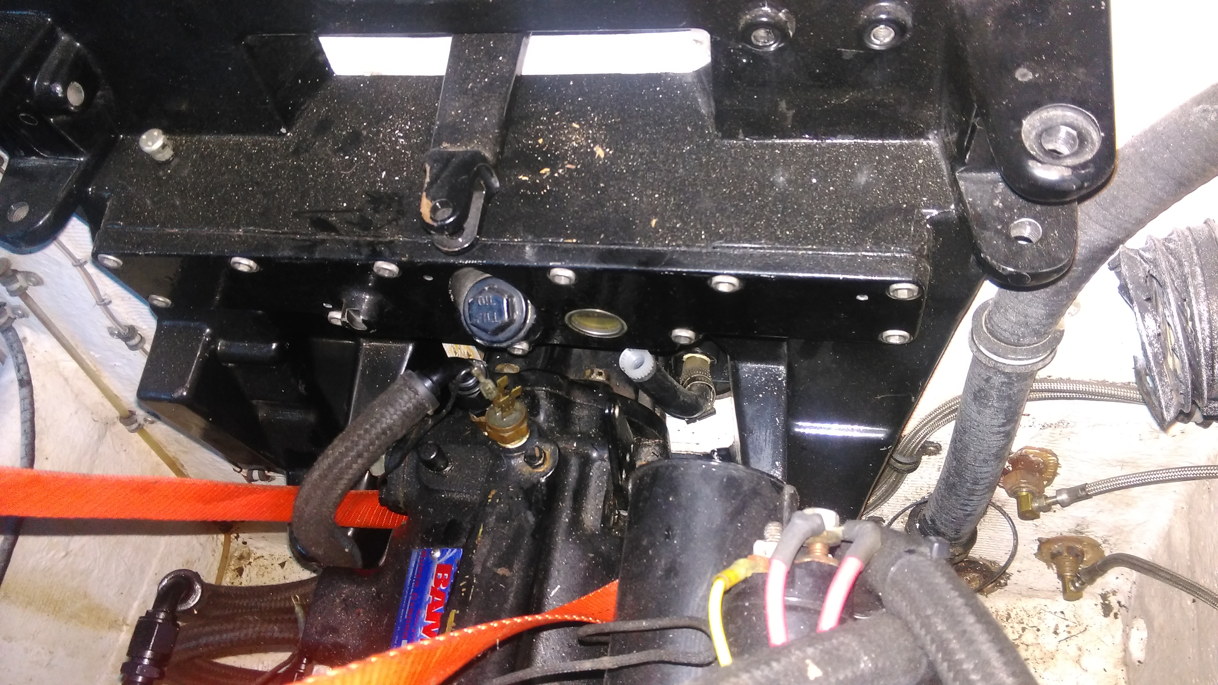 The black cap that says "oil fill" is for toping off the out-drive fluid and to the right of that is the round sight glass to see it full.
