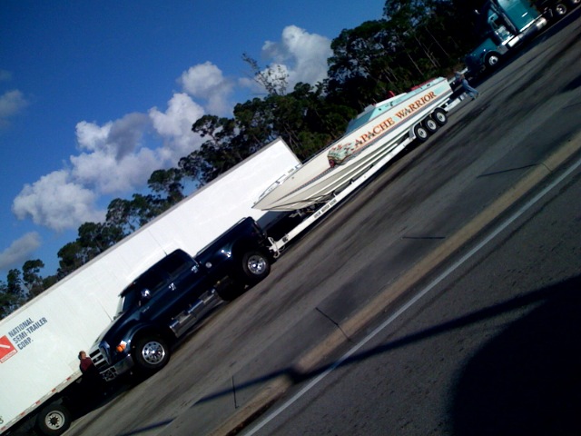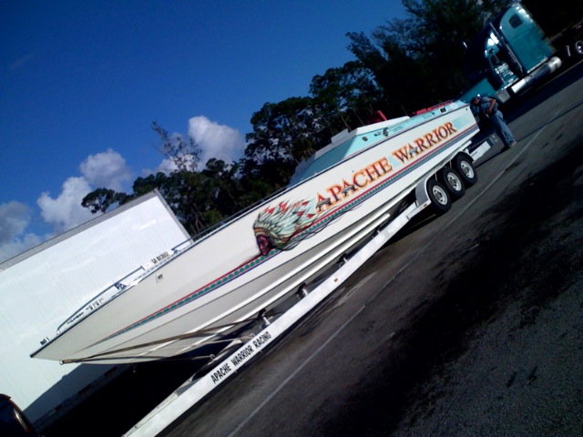 It is the boat that sits across from wicked won, but its not the Budweiser 41 boat. It is the boat in the advertisement and the picture along with the new cockpit picture. When I have some time I'll get some more pictures on. The drive train is 582/720hp United Racing Engines with #4's. It originally had 3's but when it was redone at McManus #4s were put on and tested at Lake X. The boat runs 78 and has a full cabin. It was a light boat and still only weighs 11 thousand pounds with the cabin. There is another boat in my area but I don't belive thats the Budweiser 41 boat either. The original paint on that just said Team Apache. Its an earlier boat then mine. Mine is number 12 hull. It is a staggered boat.