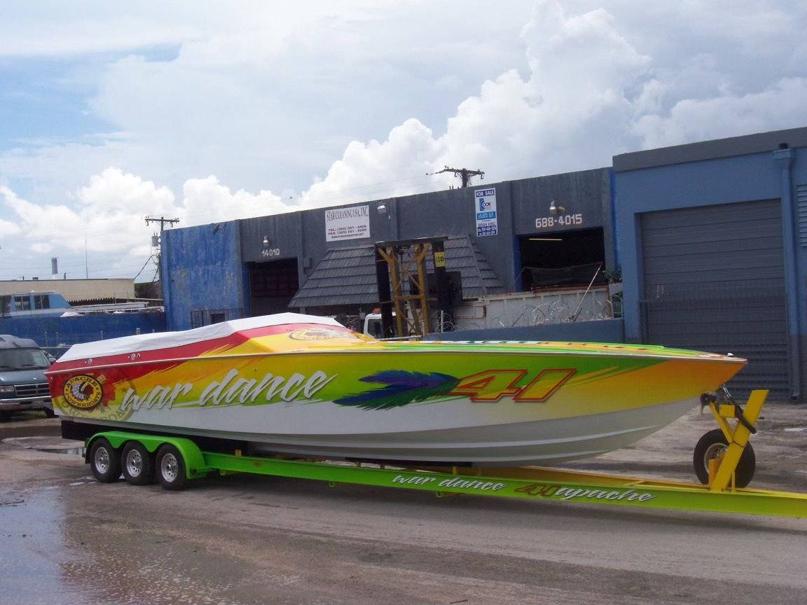 Wardance is back home in PA and ready for sale. Manufactured in 87 and appeared at the NY boat show in 1988. She has been redone 3 times (Jenny's Express, White with Indian head, and now Wardance). She has had three owners. The boat is not currently running but does have new engines to go with her. If interested please send me a message. Best offer.