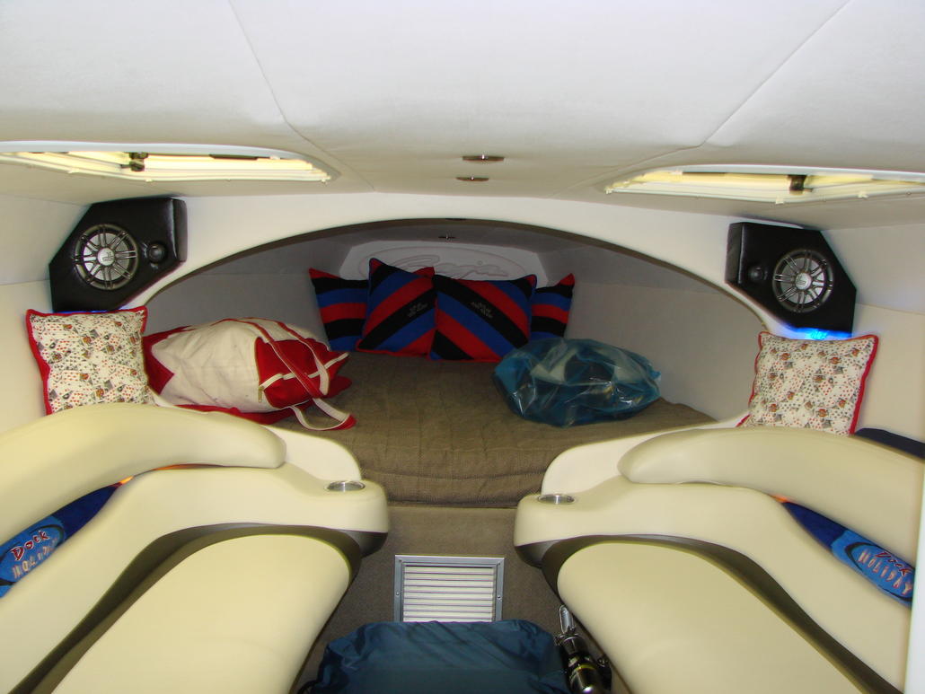 Ed built some really nice speaker mounts for the cuddy with some blue LED lights which were a nice improvement over the sound and look of the speakers Baja had hanging with brackets that always dropped down in rough water.