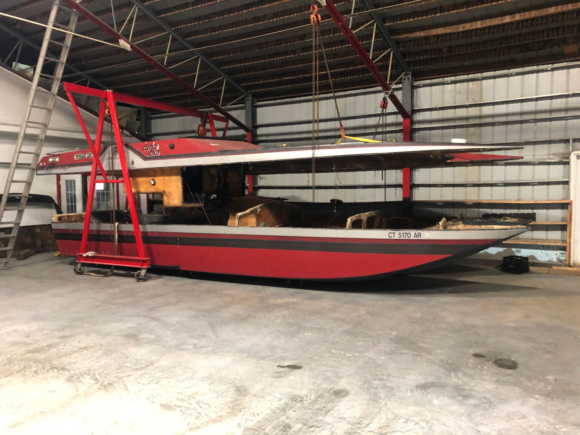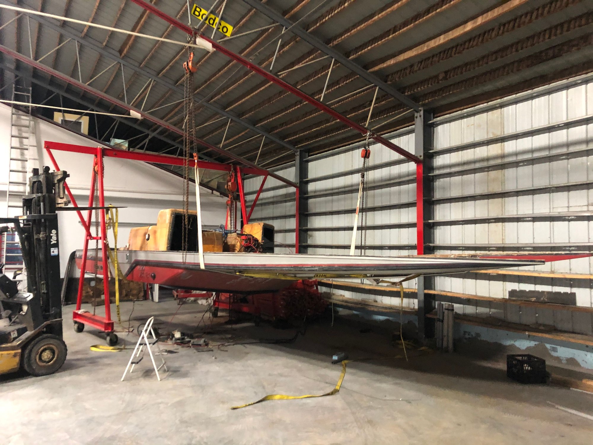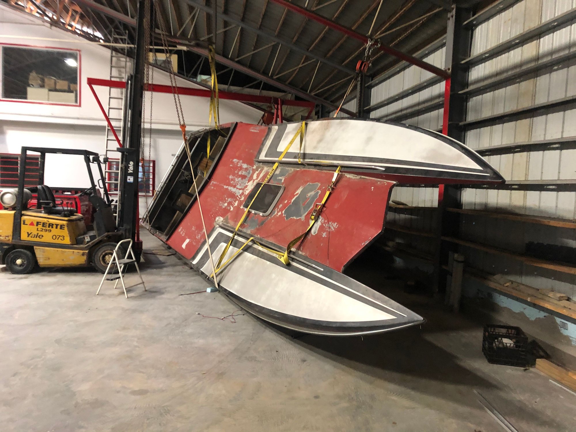 Home for the week end! Did not move much on my resto since i split the deck from hull... had to lower it bak on when i took everything out to pour the concrete floor in december! Today i simply lift it off the trailer to put it on the floor cradles... then will lift and flip deck again! Luckily i have 2 other running boats so i work on it when time is available! Not on the same pace Heath or Dan are moving on their resto for sure!