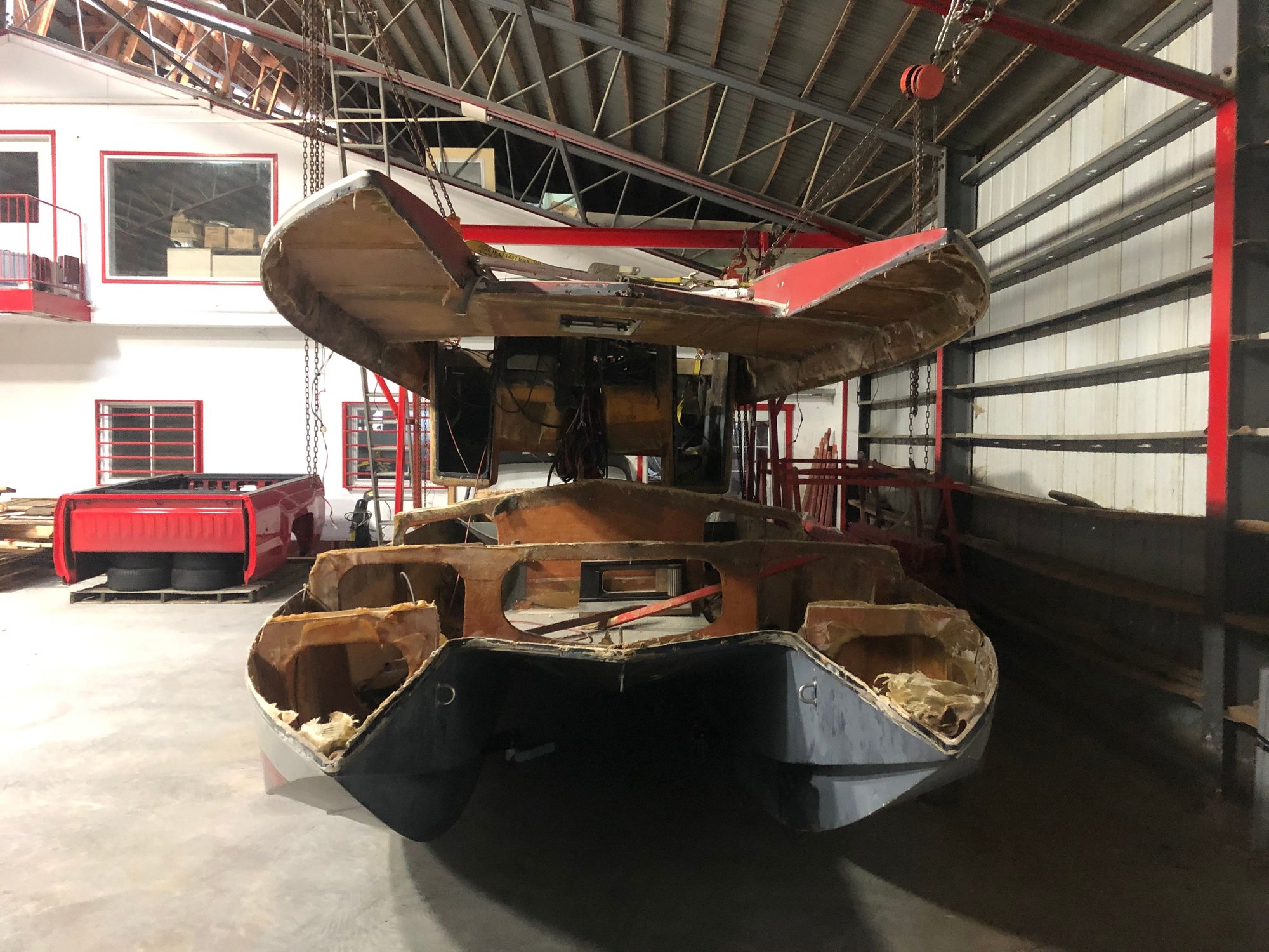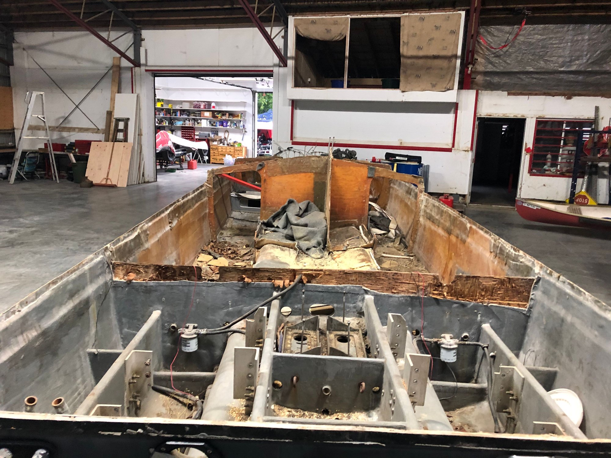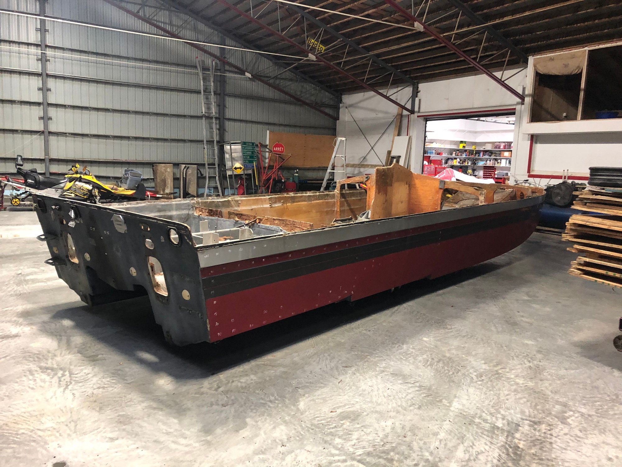 Home for the week end! Did not move much on my resto since i split the deck from hull... had to lower it bak on when i took everything out to pour the concrete floor in december! Today i simply lift it off the trailer to put it on the floor cradles... then will lift and flip deck again! Luckily i have 2 other running boats so i work on it when time is available! Not on the same pace Heath or Dan are moving on their resto for sure!