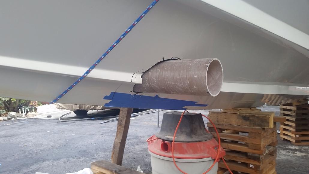 Just a quick update. I was delayed a little on project...lost my space where boat was worked on. Had it moved to my house. Now I have to finish quickly, it's tying up part of my driveway! Picture attached is bow thruster tube being fitted. I'll send more pics when there's more progress. I would like to be finished for this summer!
