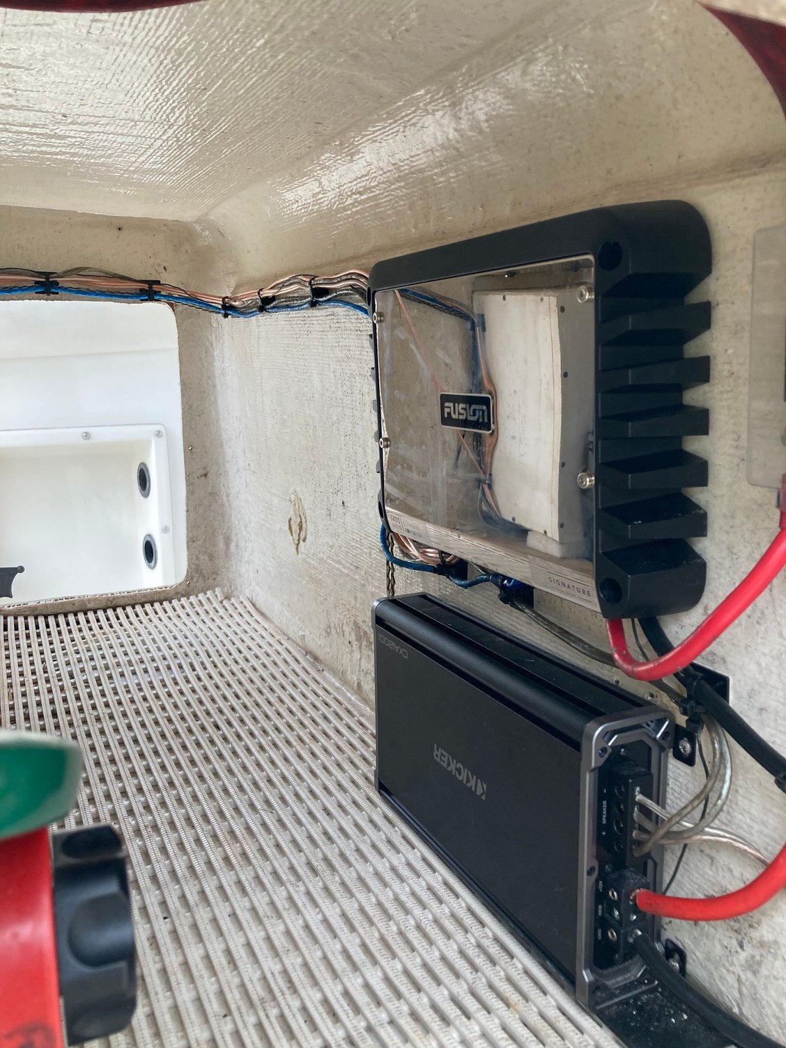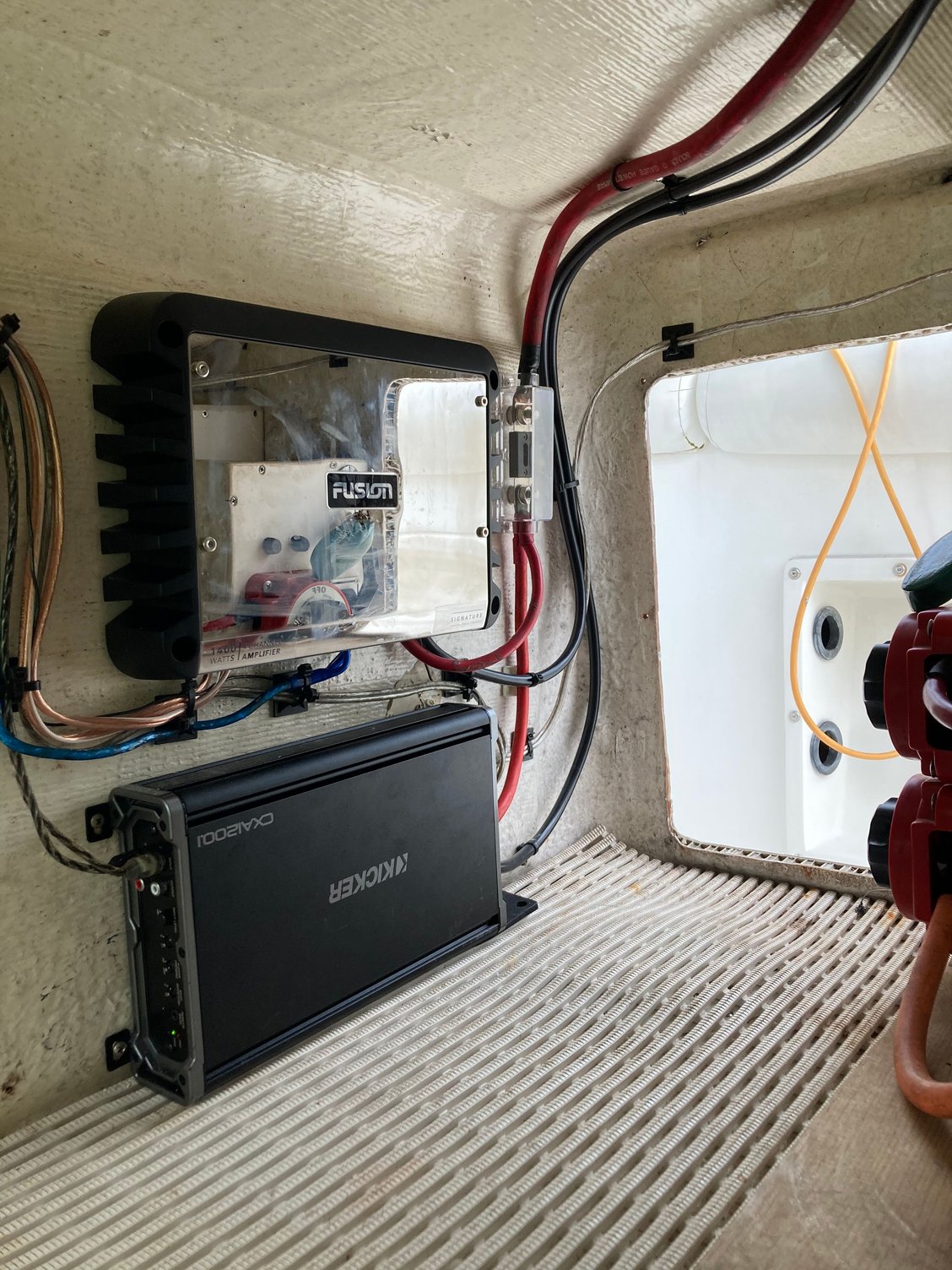 I’m a stickler about building subwoofer enclosures so I can put serious power to the subs. Most boats are fairly lame for bass ime. I’m currently running 2 10” solobarics in starboard enclosures with 12-1400w rms. I’ve got 4 7.7s fusions near the floor with 110rms each. That’s just sufficient for my larger CC cockpit while cruising. Mainly because my backseat is too far from them.