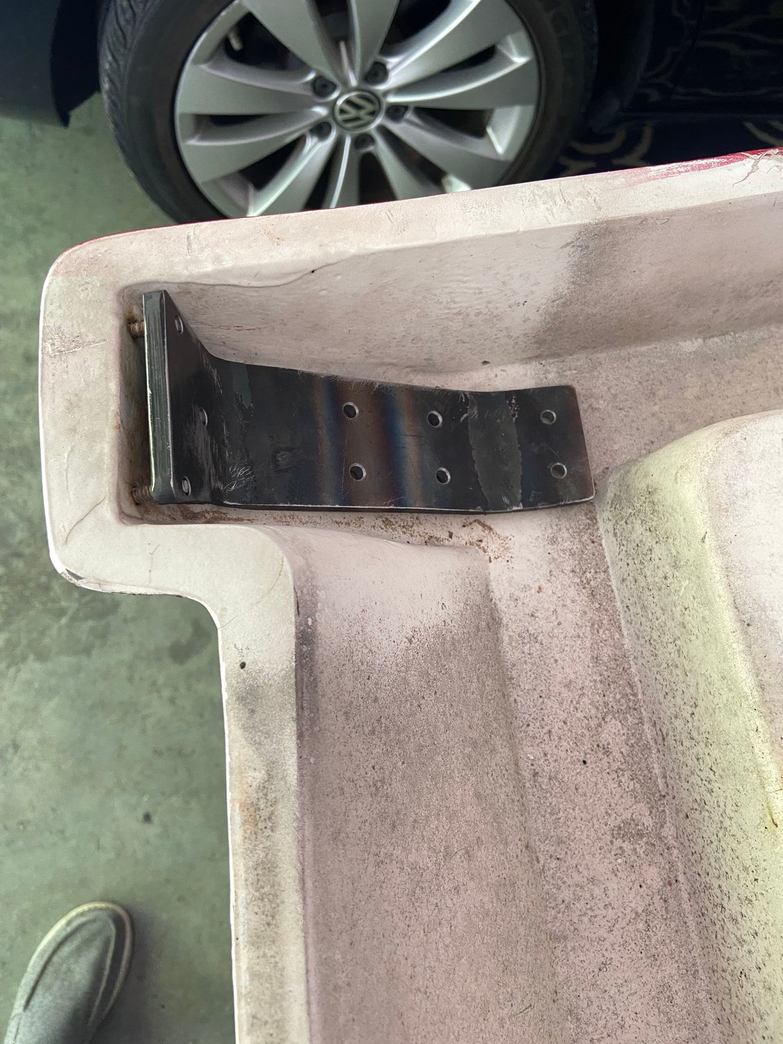 anyways father and I fabbed up some hardware to put on there to eliminate that and take some pressure off those stupid little hinges on the back. I got them coated white before I stuck them on photos you see are for test fitting purposes etc!