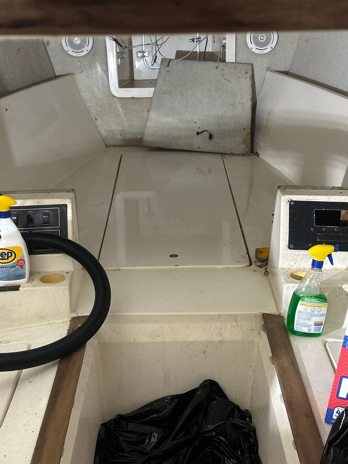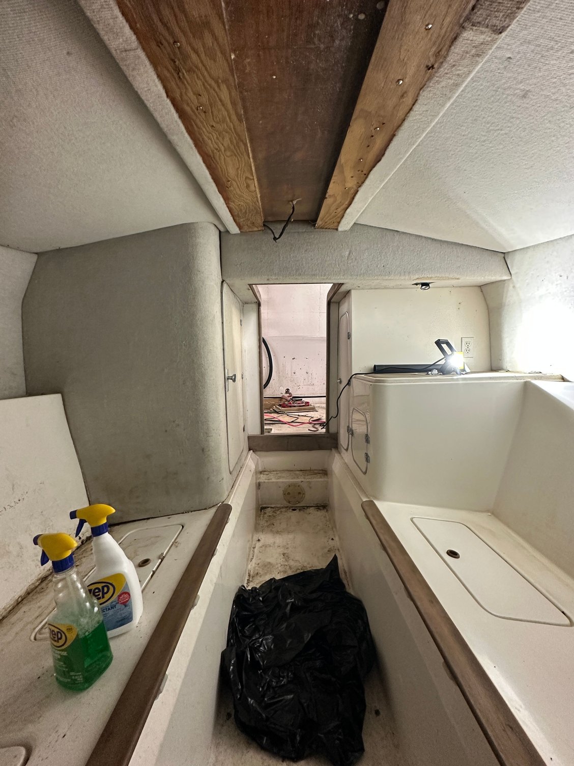 Not too much to update on.. I have slowly been squirreling away parts when able. I finally got her inside a week ago (sandwiched in between a 27 Maltese Magnum and my friend’s 38 Scarab project) and started cleaning out the cabin. It wasn’t great but will clean up halfway decent after some more work that will come later.