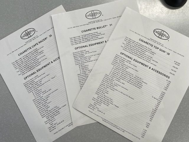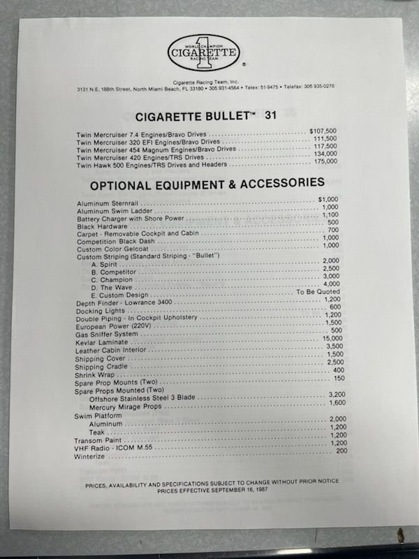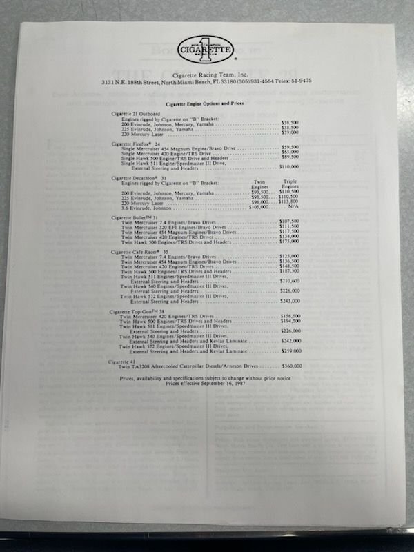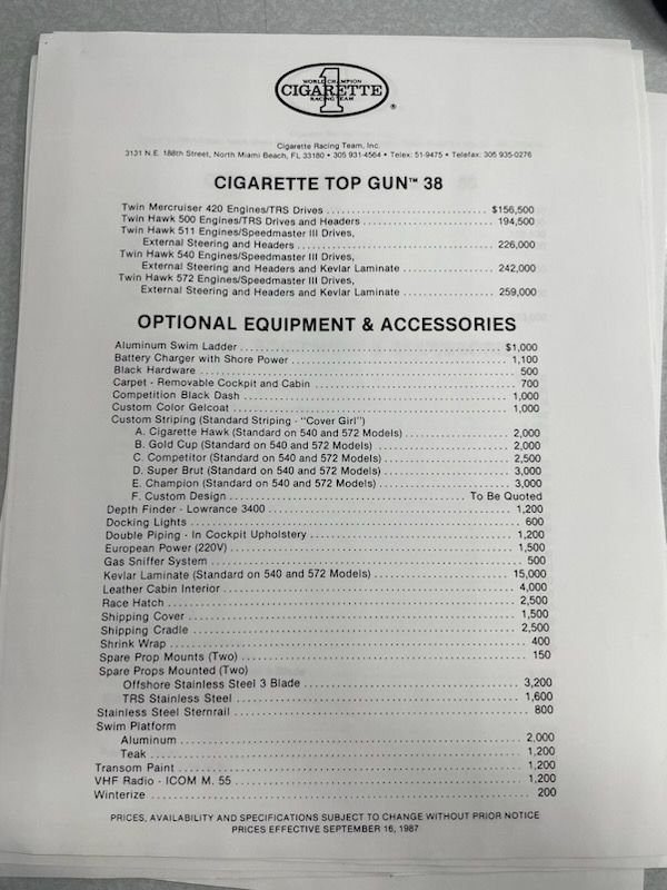 Also have the price sheets for the 31 Bullet, 35 Cafe Racer and 38 Top Gun boats from 1987.