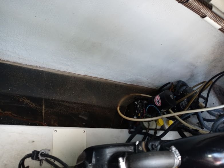 The outboard sides are a different story. As you say there aren't drains for that area, The port side is not tabbed in at the transom so it waterfalls into the stringer and there is a hole for it to come out of. The starboard side is completely tabbed in and gelcoated so there is nowhere for the water to go.