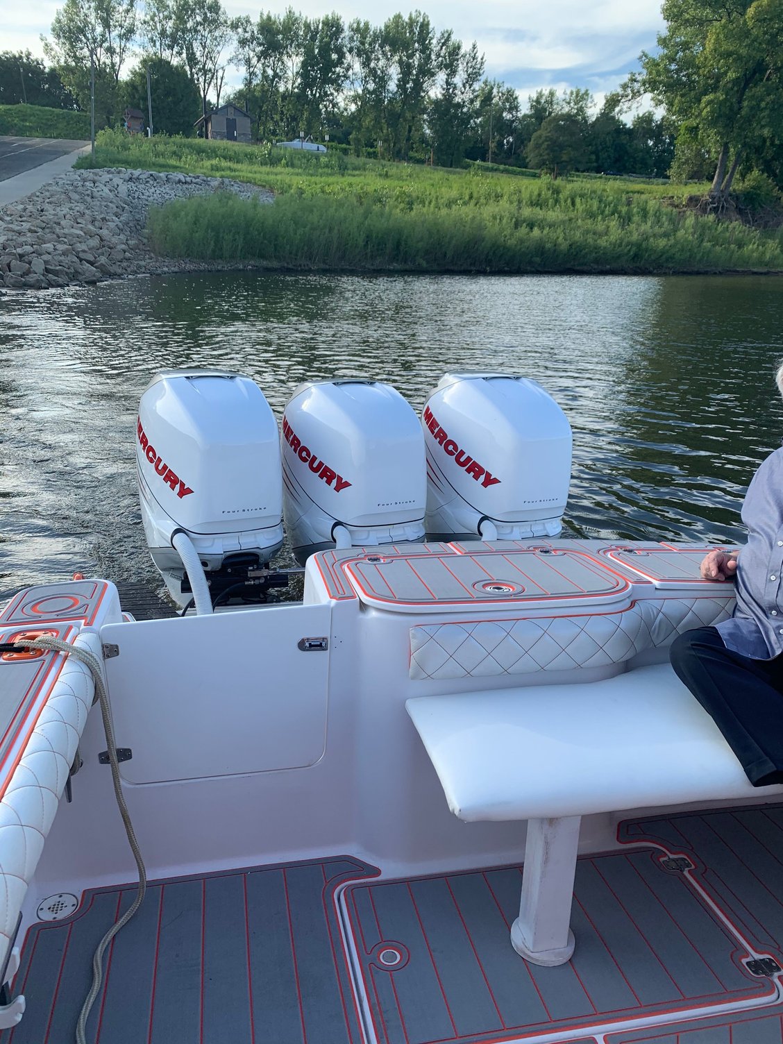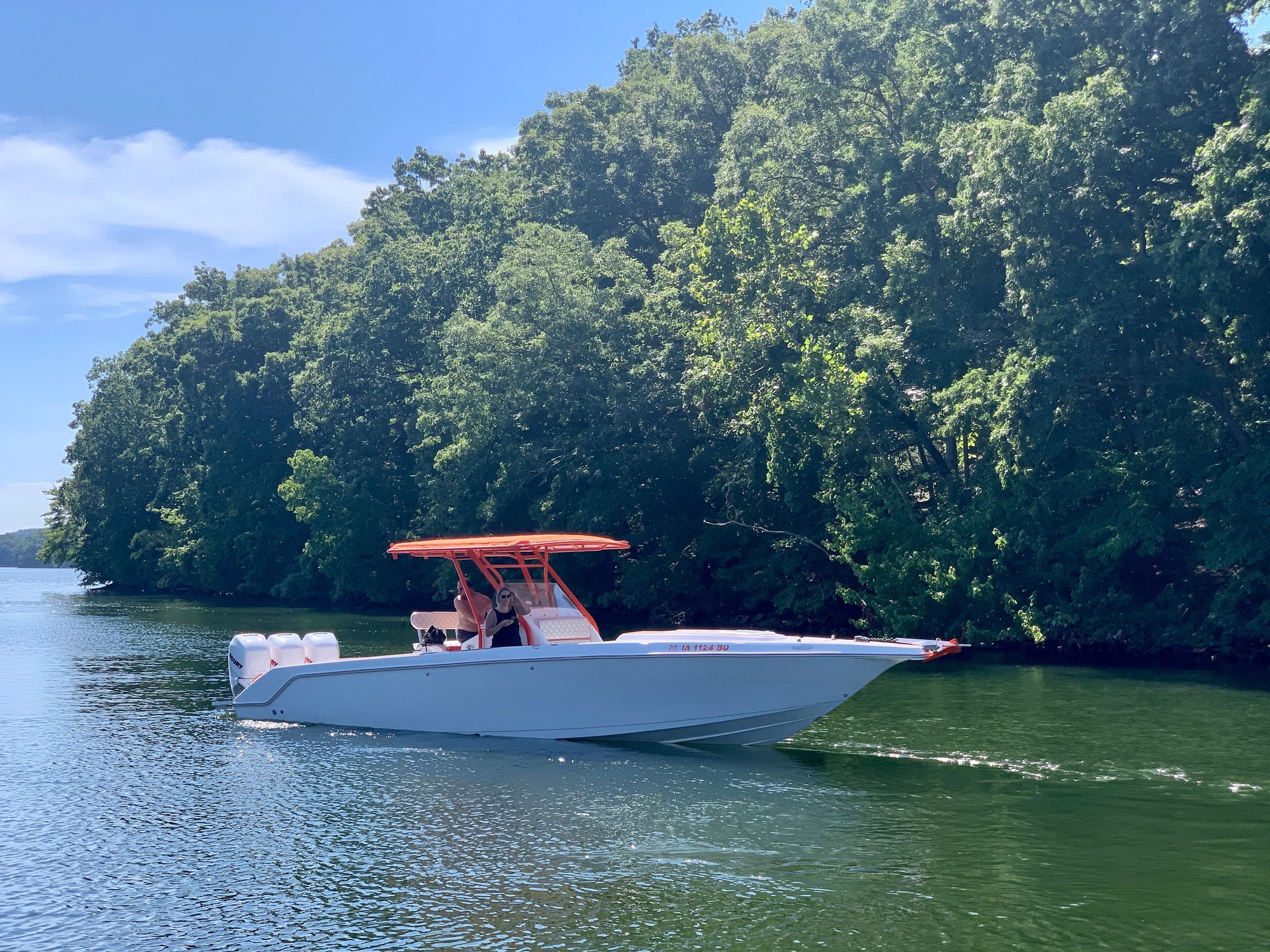 She got wet yesterday!!! We dropped her off Wednesday night at the marina and they got the control modules programmed and the hydraulic lines bleed. After work we dunked her in our local reservoir and did some testing. For a couple of amateurs we did ok. She ran 65mph at 6250rpm spinning the very rough 22p bravo1’s off the opti’s. I calculated the slip and we are at 13% at WOT. We do have a few issues to work out.