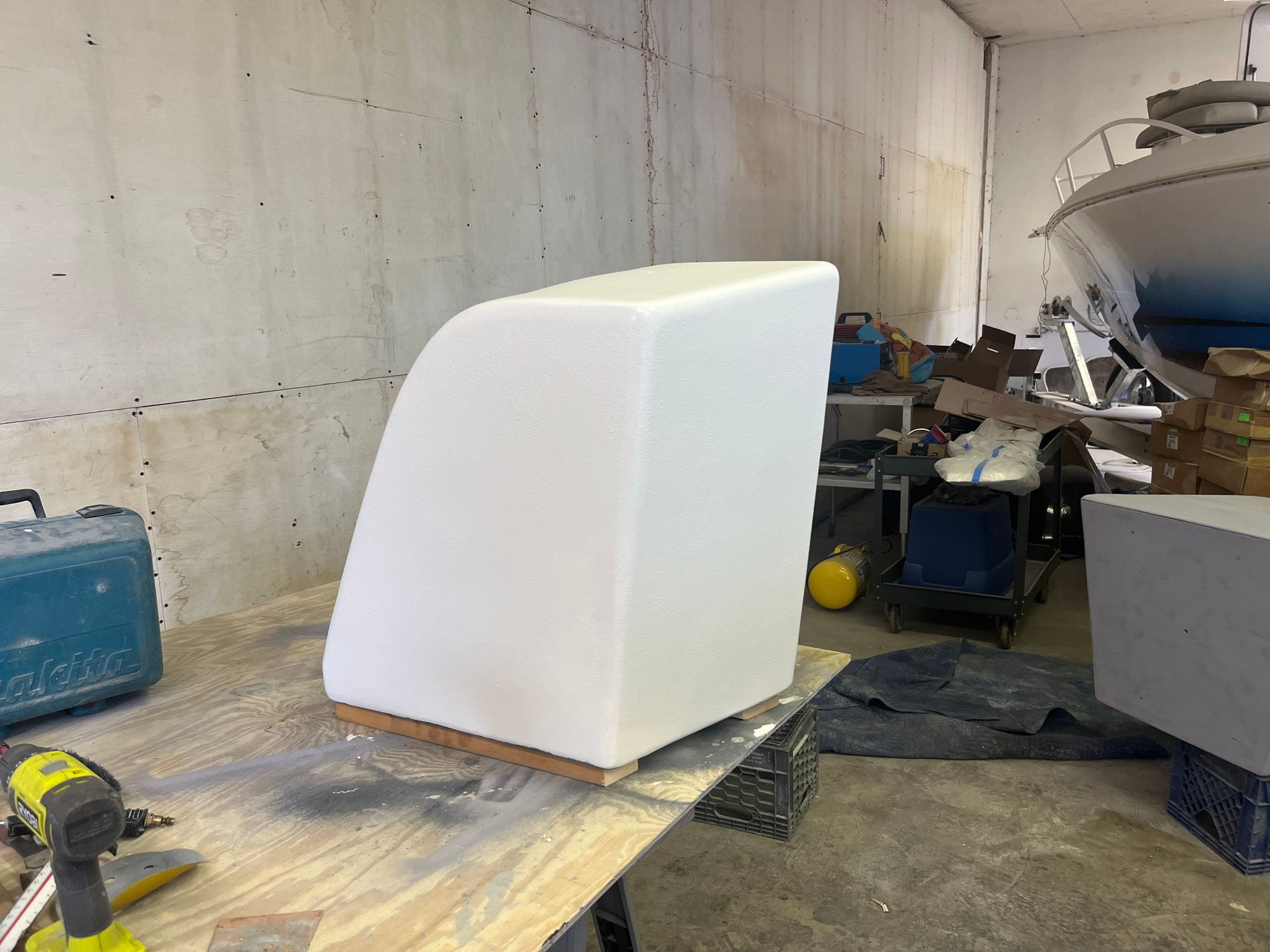 I foolishly thought initially I would be able to lay up in these areas, impossible for me. So then I figured out that I needed to make plugs. I used 3/8 Nidacore to make the plugs. The 3/8 was flexible enough to conform to the curvature and angles. It was also the maximum thickness the tank walls would be. I expect less than 3/8. The areas were then furred out with 3/8 Nidacore strips and hot glued in. The 3/8 strips would approximate the tank thickness after laying up on the plug. I used some 1” Nidacore on the hull side for a little wiggle room. A temporary floor and bulkhead were added.