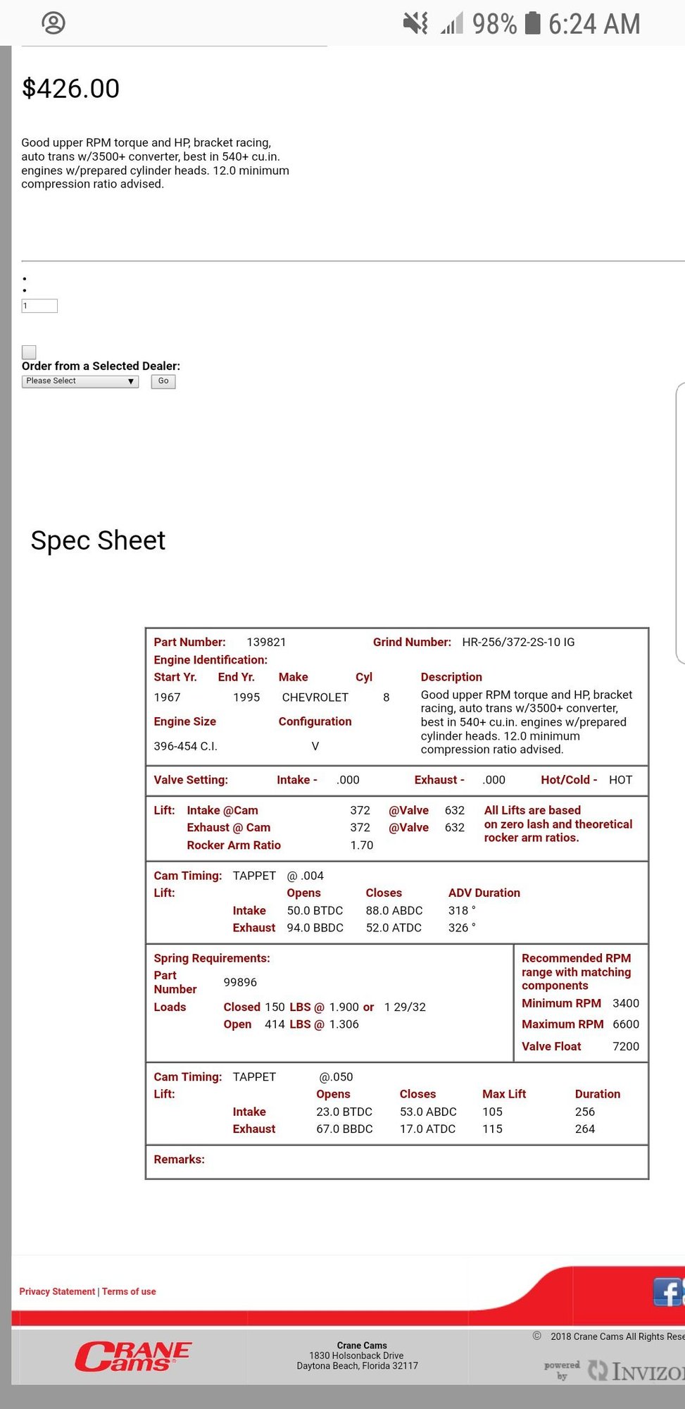 Tom, this is from cranes website. I'm only at 10.5 compression and 509ci though
