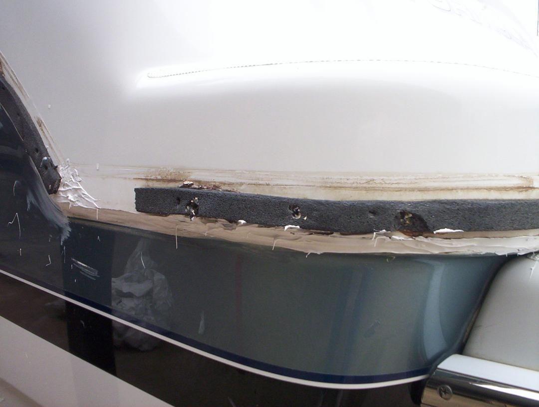 Next was clean off excess bonding sealant on the exposed hull, then make nice straight lines and clean up. Next reinstall rub rail and SS insert.
