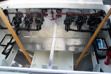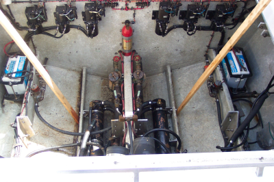 The outboard two are for hatch lifts. Fountain robbed the parts bin and used an old hydraulic cylinder that was originally an assist for 400 TRS cable steering. I know this because I had one that was leaking. Robert Toll (sp?) from Fountain gave me the scoop. They use the same pumps as k-plane/outdrive but lowered the pressure so as not to blow the seals out.