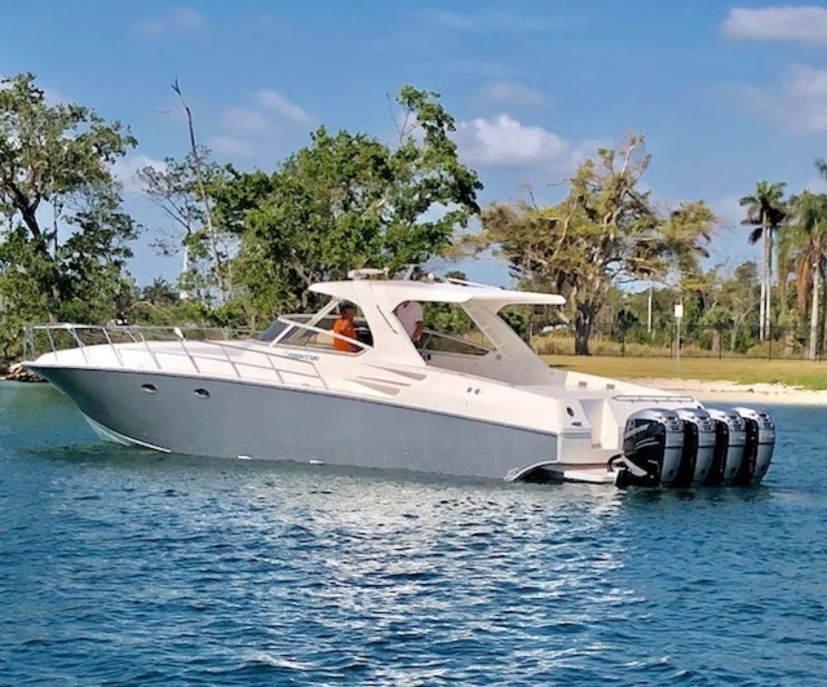 and those OB's look so much better tight against the transom vs. 4 feet back. This is the exact model I'd buy in the open bow version, triple 350's runs 58 MPH, I'd guess triple 400's would get you 62 (based on the 4 mph top end jump from going 300 to 350's). 3 motors, great looking boat and runs over 60 mph!