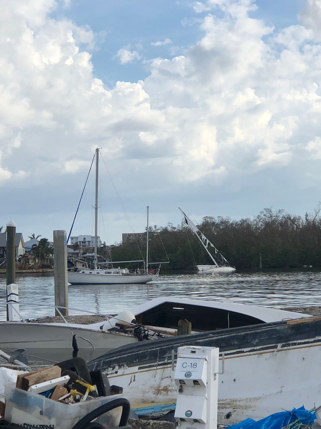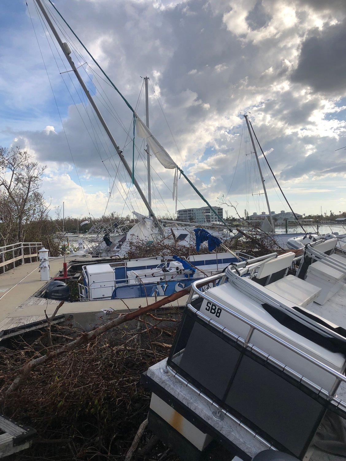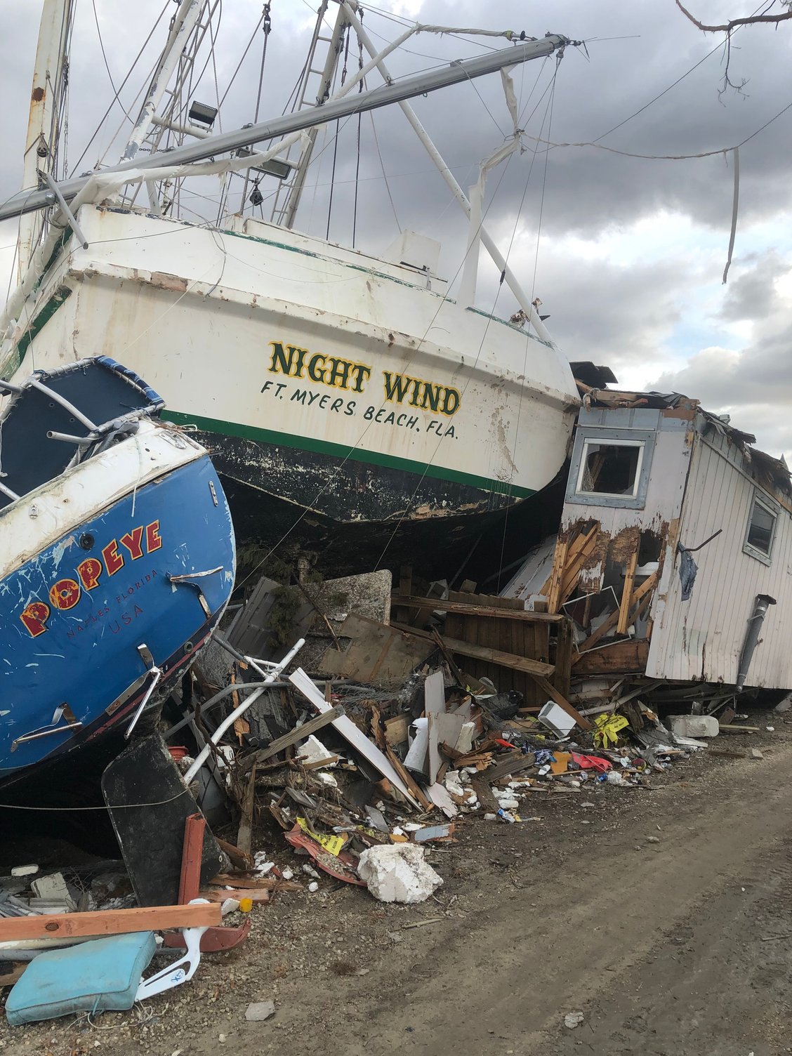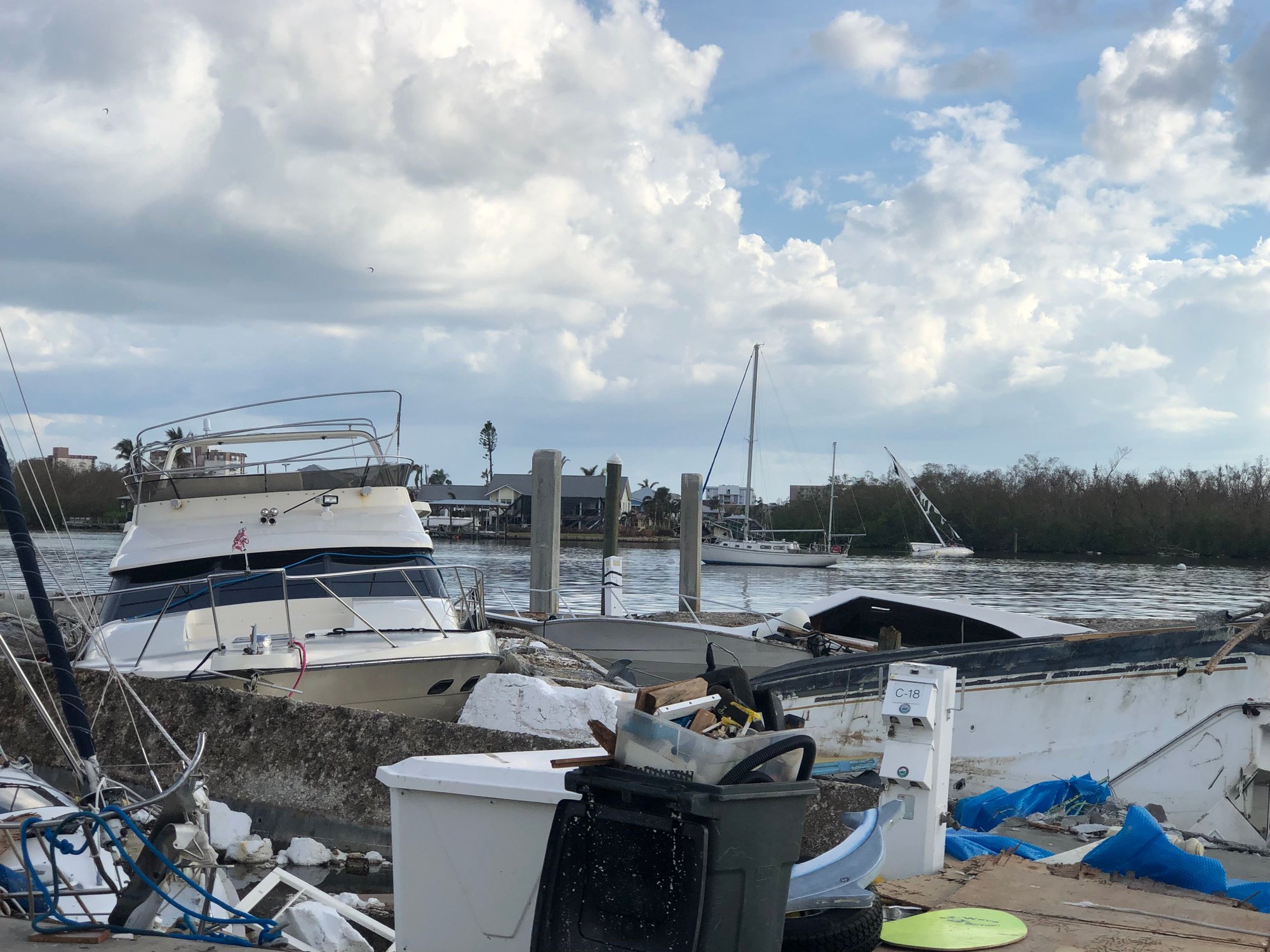 4. I have no idea why the man in prior post picture of the Hatteras did not move his cruiser to another location, but many of us stayed put because the concern at route 75 would be too backed up to travel, and lack of certainty which way the storm may track. And maybe he felt that the storm was tracking north of the Fort Myers area and the Tampa would’ve been a poor choice based on the Fort Myers major TV stations weather forecasting.
