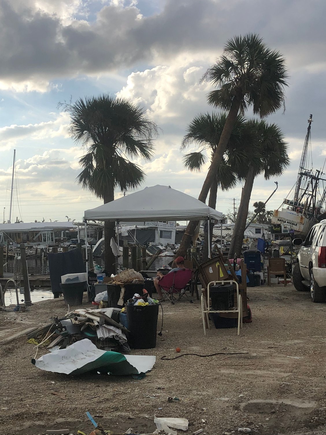 He was just camping under a awning on the waterfront with a few of his possessions he could salvage , Happy as a Clam that we brought him a Handle of Rum and 3 bags of ice.