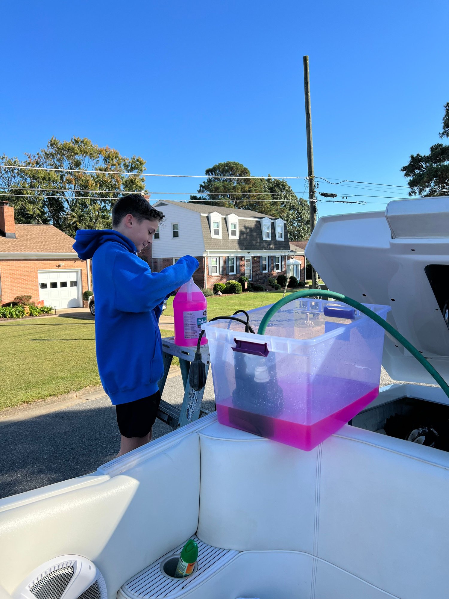 Although we don't winterize at all anymore, now that we keep the boat in my shop, and I'm here everyday (and we now have a 1/2 closed cooling boat), I've done something similar in the past. I do have to say the sump pump is a BRILLIANT idea, and I'm somewhat disappointed in myself for not thinking of it myself. I actually made up a Y connector that allowed me to run a hose to the earmuffs on the outdrive, with the third hose leading to a bucket that was filled with AF. I'd get the engine warmed up, which opens the thermostats, then I would, open the hose to the AF and close the valve to the water. One of my kids would be there ready to pour more AF into the bucket to keep up with consumption. When I was satisfied with the color of the water comming out of the exhaust, I'd fog the carb with engine oil, very lightly at first, increasing the dribble until it all but choked the engine out, then have the other kid kill the ignition. this worked great for the ten years or so we kept the boat in cold storage over the winter. I will say that we usually had troubles getting the engine to consume the AF from the bucket, as we were relying on gravity to feed it by siphon. It worked, but not like clockwork. The sump pump solves that issue. If we ever get back to needing to store the boat cold, I will definitely incorporate that into the process, including upsizing to a plastic storage tote, instead of the 5gal bucket.