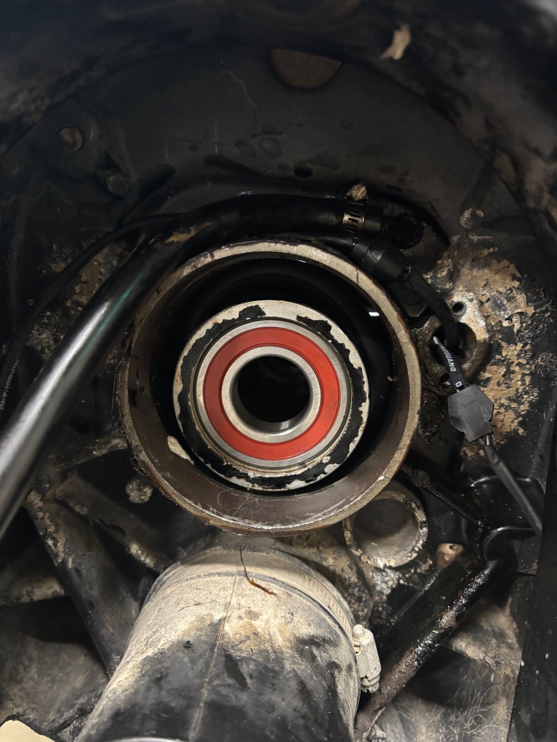 !986 Donzi Hornet III, 502, Borg Warner transmission, TRS drive. I had a knock when the wheel was hard over, so I'm replacing the U-joints. I replaced the Gimbal bearing, and noticed the bearing housing, which is the Borg Warner tailstock was WAY low. because its only a few inches from the rear mounts, I think I'd have to drop the front mounts by inches to get it to line up...I have the springs and fibre washers in on the rear mounts , should there be spacers? Can I shim the rear mounts up so I'd have to drop the fronts less? There's foam or rubber ring around the tailstock that does not make contact with the transom mount...you can just see the gap at the 2 o'clock positiion in the pic....