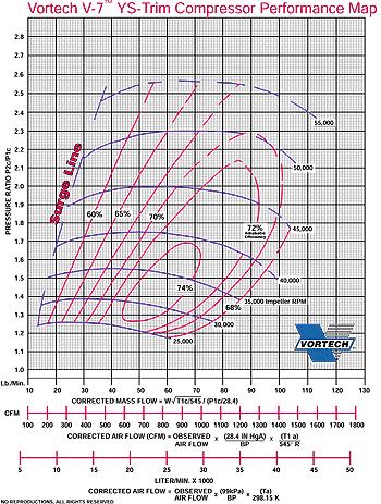 For example, a recent Car Craft article described a dyno test of the Vortech carb kit on a 454 using the V-7 YS trim compressor. The article quoted the boost level at 7 psi. But the article also said that a 3.47 " diameter upper pulley was used and peak power was achieved at 6100 RPM. What was the true operating point of this system?