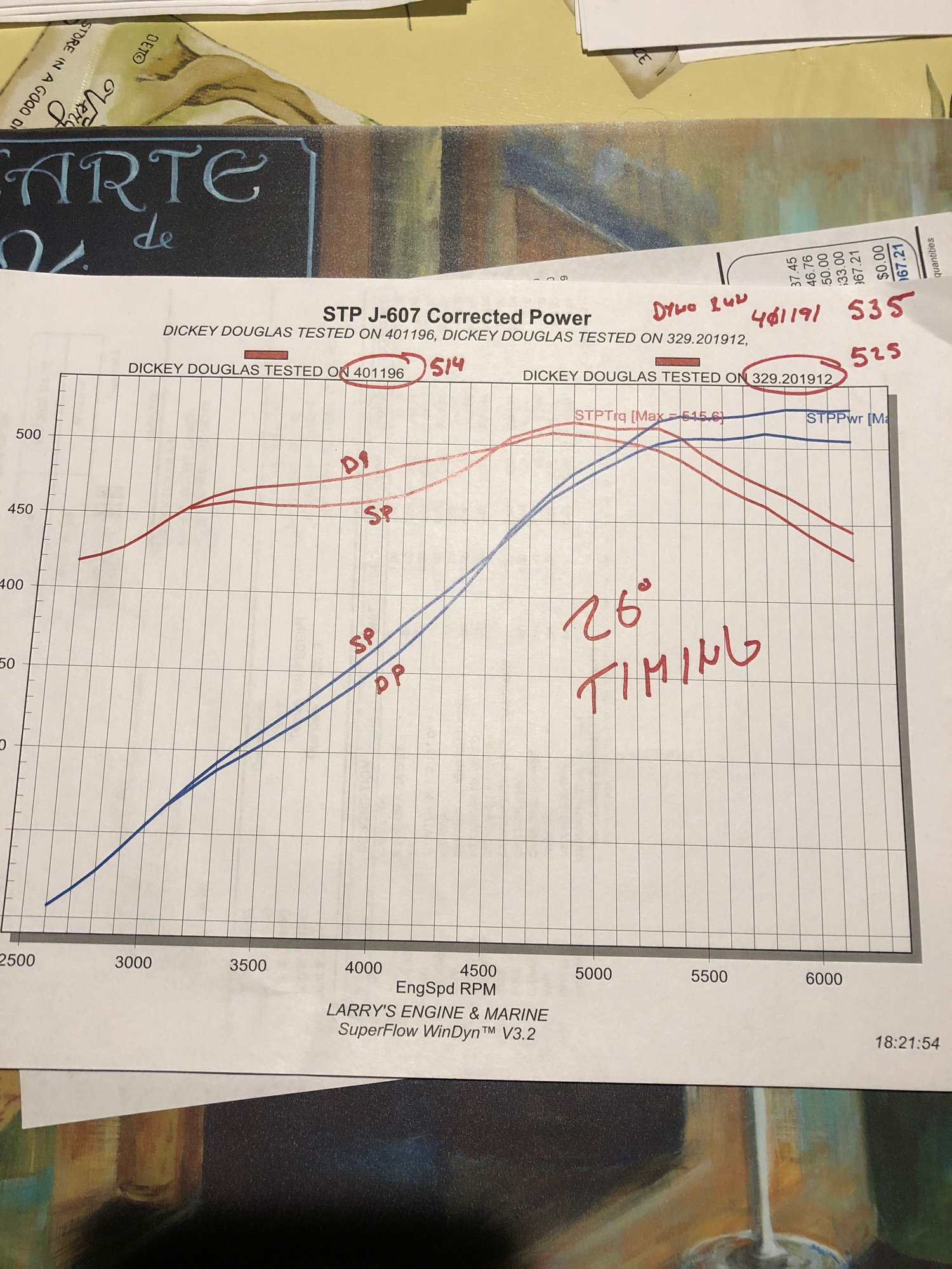 Ok. Here we go. Just to recap. Keep an eye on the ugly afr on the dp. The sp was much cleaner but swappedlean banks. Weird. Stock ls3 heads. Stock rockers. 408 stroker. 11:1 1050 4150. Full marine trim minus exhaust. J607 correction in Tucson AZ. Not max timing runs. 30 degrees showed max power but I had them reduced to 26 to beconservative and safe. The 237/237 114lsa single pattern that I designed meets the anti reversion qualities of my exhaust but as you can see flattens out at the top due to poor exhaust flow on the exhaust port. Makes good solid power all the way through but as my budget does not allow headers at this time I stayed conservative to prevent reversion. I did do a b testing for you guys ( thank my pocket book later) with single and dual plane intakes. Keep in mind that the operator before even running it stated it is very greedy. Believe me, dont believe me. I dont really care. We will be a b cam testing in the next month. Will be adding in split and reducing intake duration. Possible porting. Holy oil pressure. Lol The last shot is dual plane with direct carb mount vs 1”. It did not like the direct mount. Dyno operator and I do not particularly care for these carbs. Both flowed and ran the same but finicky and require drilling bleeds as bleed jets are oversize to standard. Not a fan. Ran decent once tuned. Idled at 800. Medium choppy idlehttps://cimg7.ibsrv.net/gimg/www.off...440884796.jpeghttps://cimg8.ibsrv.net/gimg/www.off...c7ca23a2e.jpeg https://cimg9.ibsrv.net/gimg/www.off...517e48973.jpeg https://cimg0.ibsrv.net/gimg/www.off...efbc2faf8.jpeg |