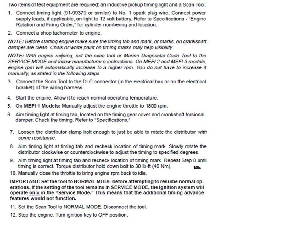 I checked the timing this morning, and with my jumper installed in the plug, it did automatically jump to 1200 rpms. At that point I checked timing with my light and the balancer mark was right between the tabs on the timing cover. I then plugged the techmate in, and it showed idle timing jumps between 4-6 degrees. I advanced the distributor to see if I could get the number closer to 8 degrees, but had no luck. I could however see the balancer mark increasing on the timing cover tabs. I took the boat out with the techmate hooked up and I could see timing increase up to 28 degrees at about 2200 rpms, and then as I would increase the throttle from there it would drop quickly to 20 degrees and just stay there for the rest of the throttle range.