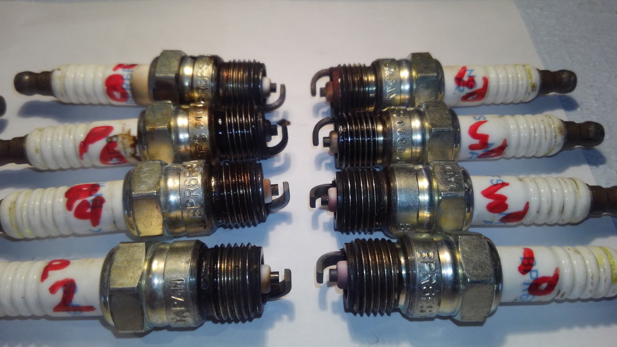 Hours unknown but estimated 425 since rebuild based on hour meters that were there when I bought the boat. Today I decided to dig deeper. Pulled plugs (pics later), Compression Test, Leakdown Test. Compression Test: Stbd 8-174 7-170 6-165 6-160 4-185 3-176 2-176 1-180 Port 8-190 7-165 6-185 5-177 4-185 3-185 2-187 1-180 Leakdown: Stbd 8-1% 7-4% 6-8% 5-46% (audible through exhaust) 4-0% 3-6% 2-0% 1-0% Port 8-1% 7-18% (audible through exhaust) 6-8% 5-5% 4-5% 3-3% 2-1% 1-7% Looks like I've found some of my missing speed. I'll put the plug pics in the next post below. |