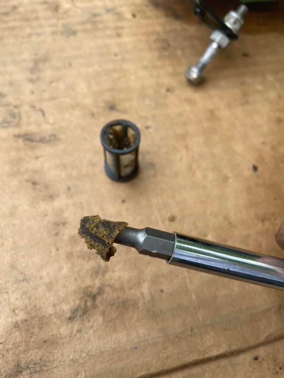 Here is some extreme examples from several boats this summer i worked on. Alot of other times, it is slighter amts, so looks like slight amt powder vs clumpy as shown below, lots of times just in the fuel bowls but get’s pulled into the metering blocks and etc. Basically, in places the fuel seems to evaporate from and leaves whatever additives don’t evaporate.