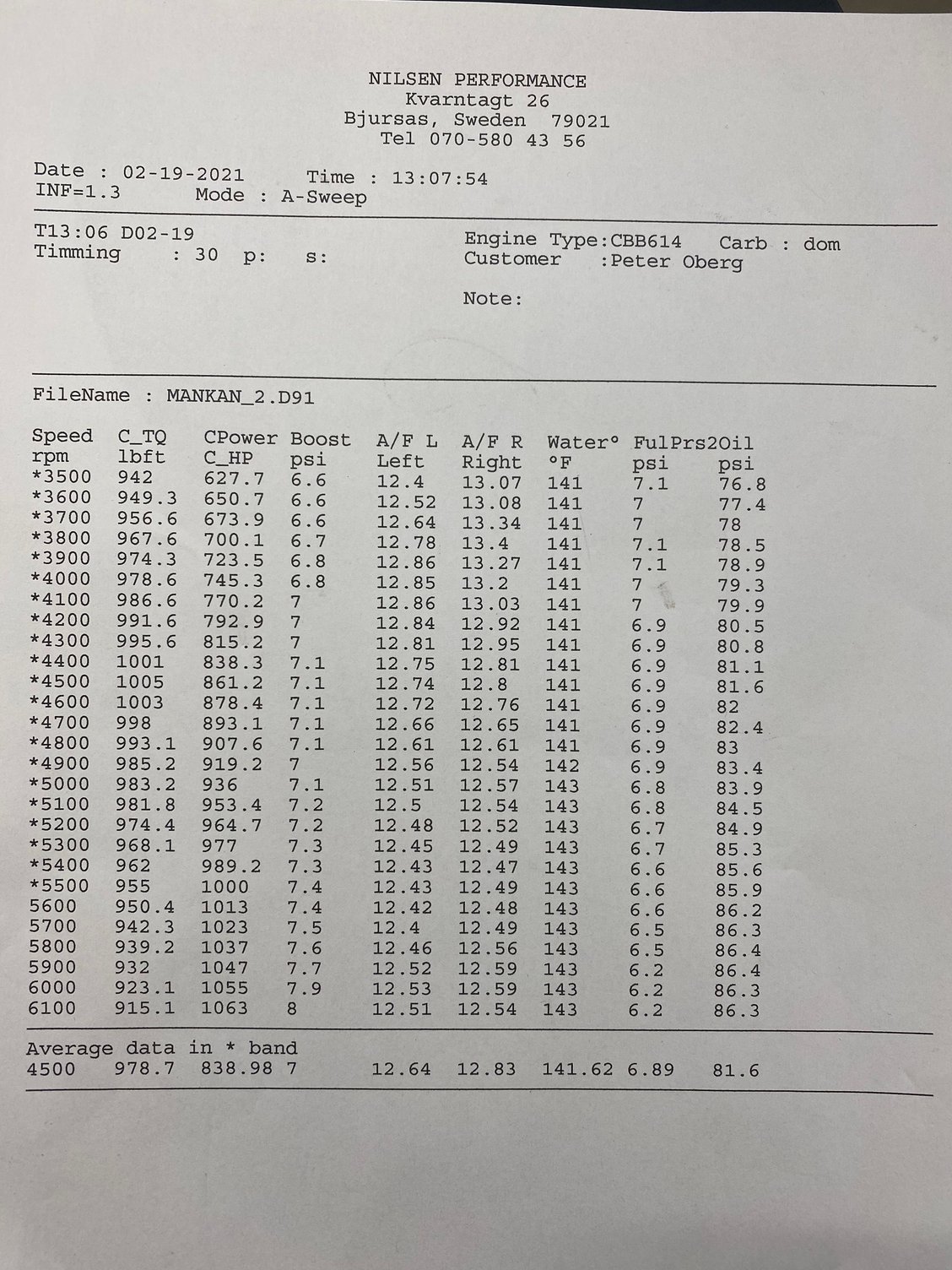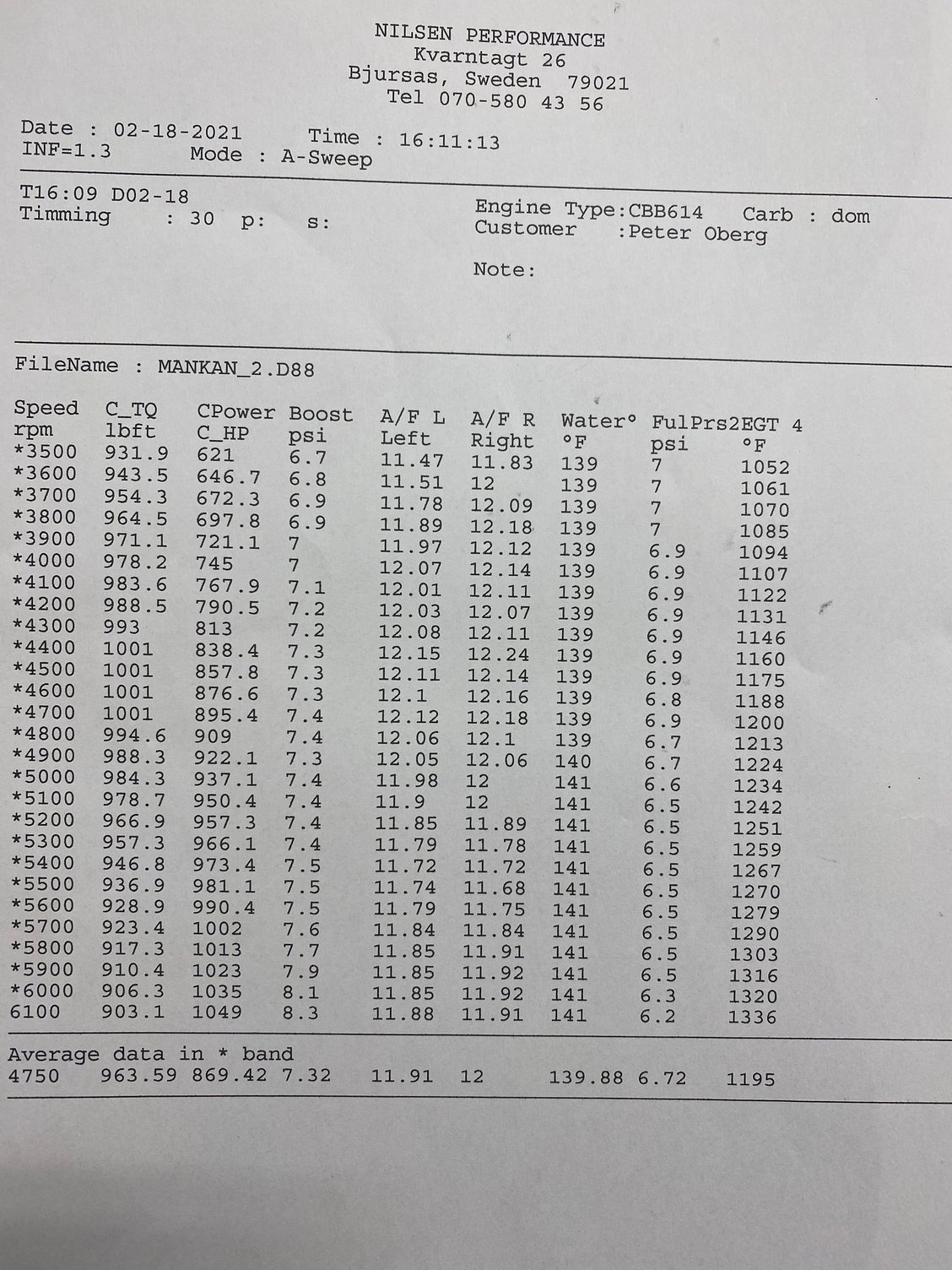 Thanks for your reply’s. Here’s what they made in the bench. Think I will order two sets of the pro steel from Jesel. Also will send the Mohawks to Jesel for rebuild and inspection, can’t hurt to stop in another engine. I live in Sweden so we don’t measure fuel octane like you and the engines where given 95 octane in the bench and I think that will compare to your 87 or 89? Timings @30 degrees