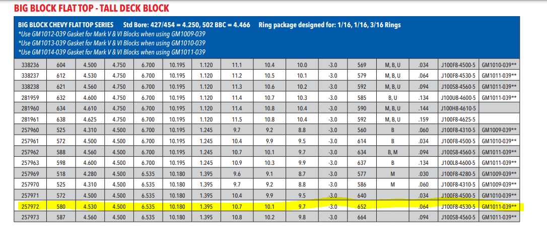 That chart pertains to standard deck blocks. My hopes would be to use a tall deck and use longer rods to minimize rod angle. I was talked off the proverbial ledge on the idea of a 632 for this very reason. I'm just looking for where the conventional wisdom is on where to aim for the stackup. Do we aim high, over the deck height, and use head gaskets to establish final head gap, or do we aim low and machine the decks? I'm sure some of both will be in the final recipe, as I'm sure the 10.2" is not a super precise dimension with a new block. Thanks. Brad. (937)545-8991 I highlighted the piston number YOU linked in your previous post. A piston doesn't know what deck height block it is in. The builder does! Reread this: Almost anything is possible with any combination $$$, but most shelf pistons are based off a set rod length, stroke, and deck height. Then they derive the compression height. Just under the 9.8" nominal for short deck BBC. All laid out in those PDF catalogs. Here if this fits you better here's "tall deck listings". Just go for broke. 4.375" crank same $ as 4.5" stroke, you're above the 1.270 CD Smitty likes, rod is a menial .165" shorter than a 6.7. And keep your Procharger regardless!! https://cimg0.ibsrv.net/gimg/www.off...34c1d6d047.png |
