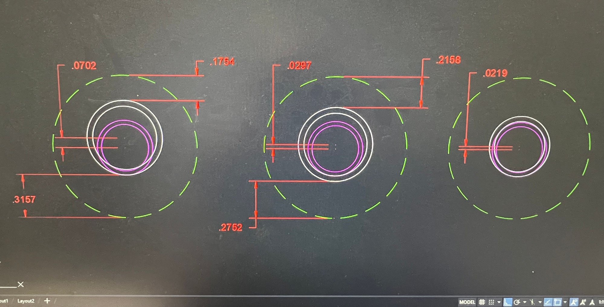 So the decision to convert to roller rockers hasn’t come without its complications. The roller tip is too far out over the valve tip and the ARP studs are considerably shorter than we’d like to see, significantly reducing thread engagement of the polylock nut. Initially, the builder decided to shorten the pushrods, tilting the rockers away from the valves and increasing thread engagement, but i was worried about the potential for side load on the stud. After some considerable back and forth (in a good way) I’ve decided to pull the heads and drill and tap the stud holes for 7/16-14, and use a different, taller rocker stud. This will also present us with an opportunity to move the stud hole a bit. How much depends on…. Factors. https://cimg0.ibsrv.net/gimg/www.off...52aa5d138.jpeg Above are three sketches that show my options. The white lines represent the machining that will be done. The magenta represents the original M10X1.5 tapped hole and the green dashed line represents the theoretical outside diameter of the stud bosses in the head, assuming they are all currently centered. The red is the dimensions, indicating both the shift from original M10 to the new 7/16 tapped holes and the material left in the boss on top and bottom after the respective shifts. Trust me when I say i CAN move a hole when making it bigger. I am showing both the major and minor diameters, which is why the double circles for each. The sketch on the right shows just a simple drill and tap, which will leave some vestigial threads on the lower side that is tangent to the new threads. The center and left sketches show what i can do if I plan for Heli-Coil thread inserts. The center sketch shows the maximum shift in hole location that will eliminate all threads from the M10 holes, and the left sketch shows the maximum shift I can make happen without stepping beyond tangency of the original M10 and the new 7/16 threads, which would, again, leave vestigial threads at the lower sector. I have no idea how far we actually need to shift the holes at the moment, but I hope to by the end of the evening. Given the difference between the 1.7 and 1.8 rockers is in the geometry between the pivot and the pushrod seat, this shift will only serve to correct any shift in pushrod seat resulting from the change from 1.7 to 1.8 rockers, so we are no worried about pushrod clearance in the guide holes between the rocker and the lifter. Thoughts? Thanks. Brad. But glad some ofyou know better than I do ! |