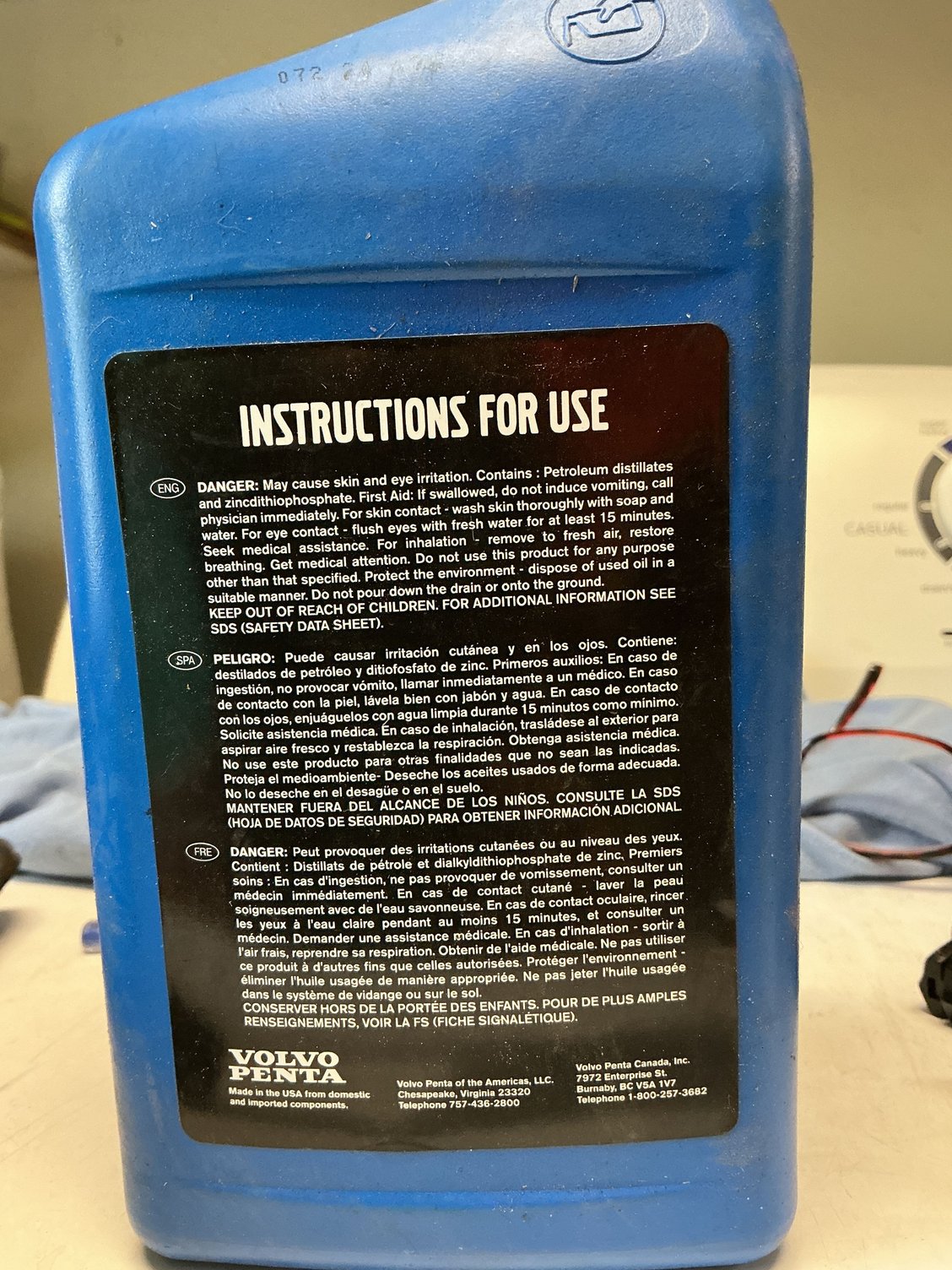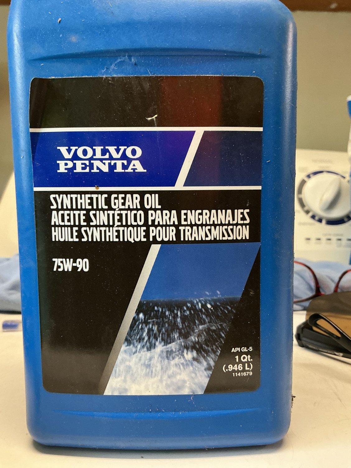 Here is a pic of the Volvo drives and their oil requirements, it’s a long diagram but took oic of maybe what you have, I know some of the early 280 drives say use 30wt oil, I have always run 75/90 in those just not synthetic 75/90, on all my dp drives the synthetic 75/90 will get pic of the oil can tomorrow for you
