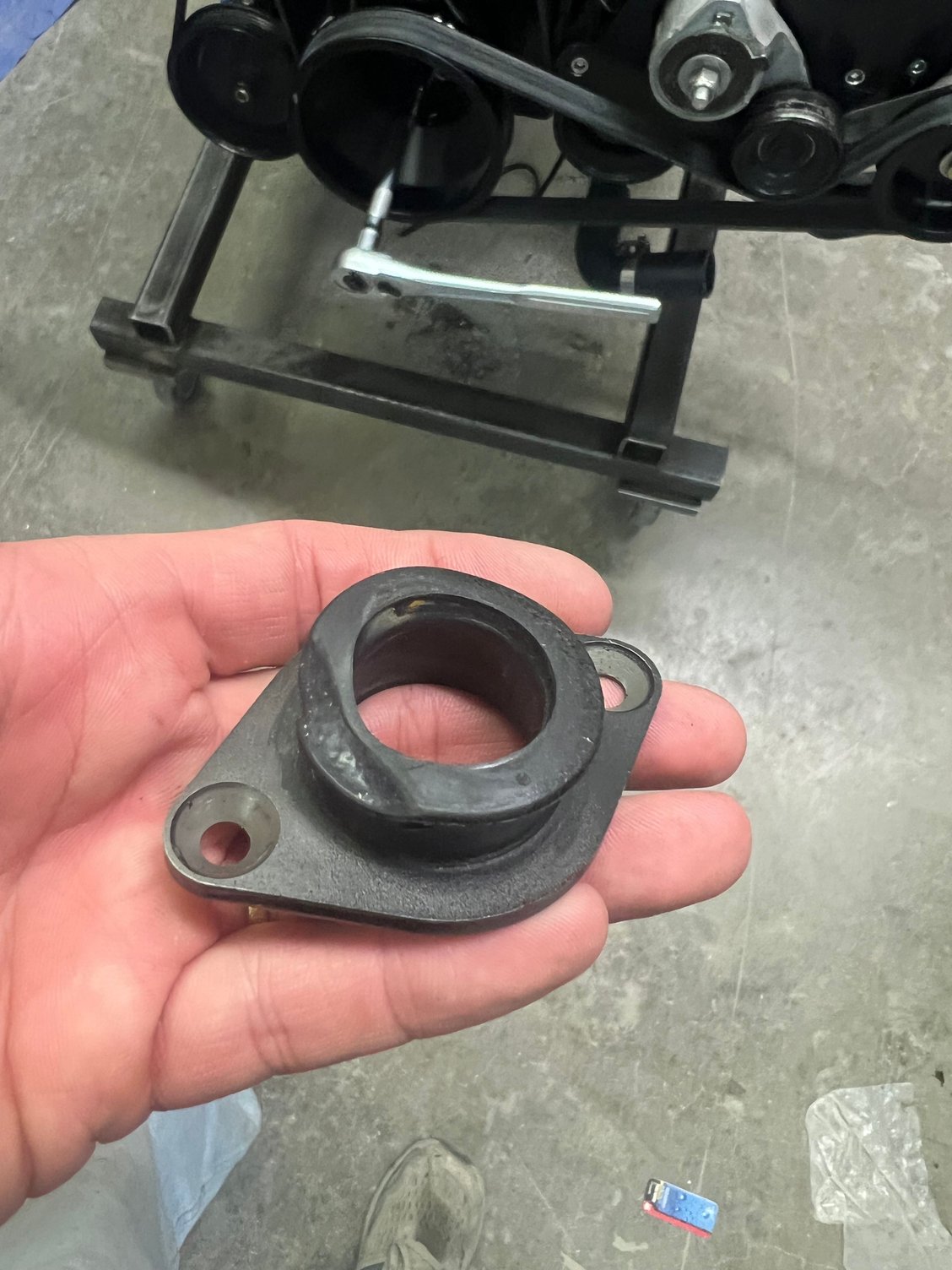 The connecter between the crossover and the circ pump. It’s my assumption that this was leaking. I also decided to replace the T-stat with a 120°, and, while in the process, discovered that the T-stat seal was all but crushed out. It was hardly proud of the top face of the crossover. So I ordered a new seal. All that’s back together.