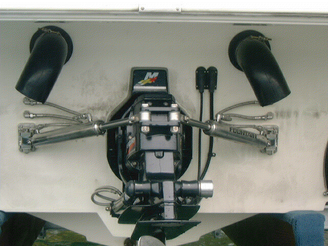 Well, the weather was too crappy to do the dB reading, but here is a picture to show how I angled the Troutly Rubber Mufflers outward to keep the heat off the steering rams and hoses. I will try and get sound level readings after I get back in town later in week, and will report.