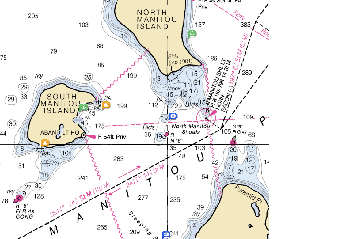 We have thought about doing the same trip many times, just never found the right time to do it. Seems like you have it planned out right. The way we look at it, at worst you are 30miles from either shore. We laugh about it because we take off from Wave Point to Chambers Island without a second thought not even an extra bottle of water ( ok we are not that bad we make sure we have extra ice). Wave Point to Chambers is 28-29 miles one way. Granted there are a few outs on either side of that track.