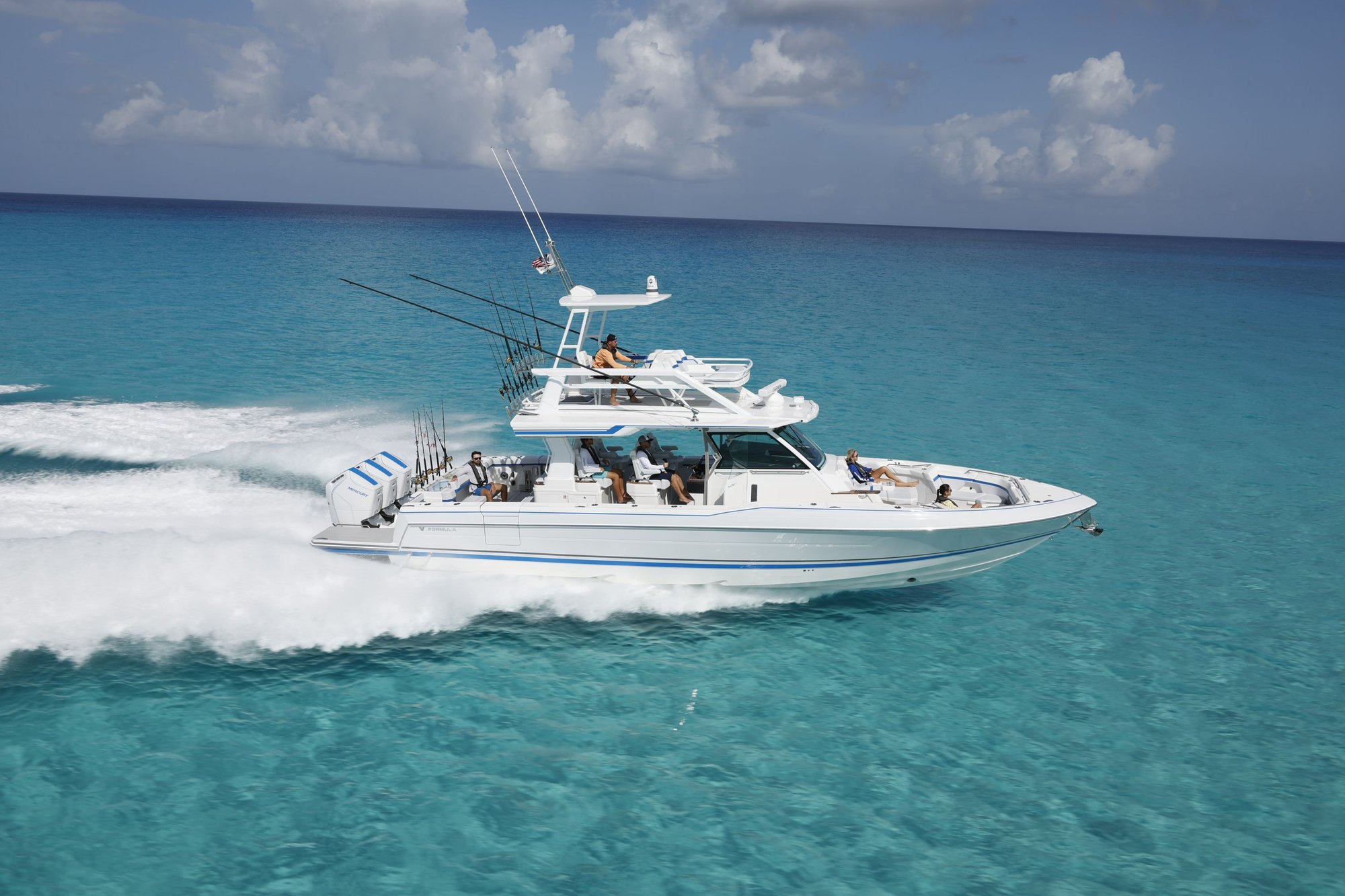 and Sport models, executing the ultimate in performance, ergonomics and amenities in the center console market. At 45’7” LOA with a 13’9” beam, and powered by triple Mercury Verado 600 HP engines, the Formula 457 will impress all comers. Formula’s exclusive designer John Adams, joined by designer Michael Young, has delivered yet another new platform in the center console world which embodies the evocative yet instantly recognizable Formula masterpiece of form and function, while opening new vistas for established Formula boaters. The 457 CCF is a dedicated and designed fish hunter, shaped and equipped to haul in your catch.