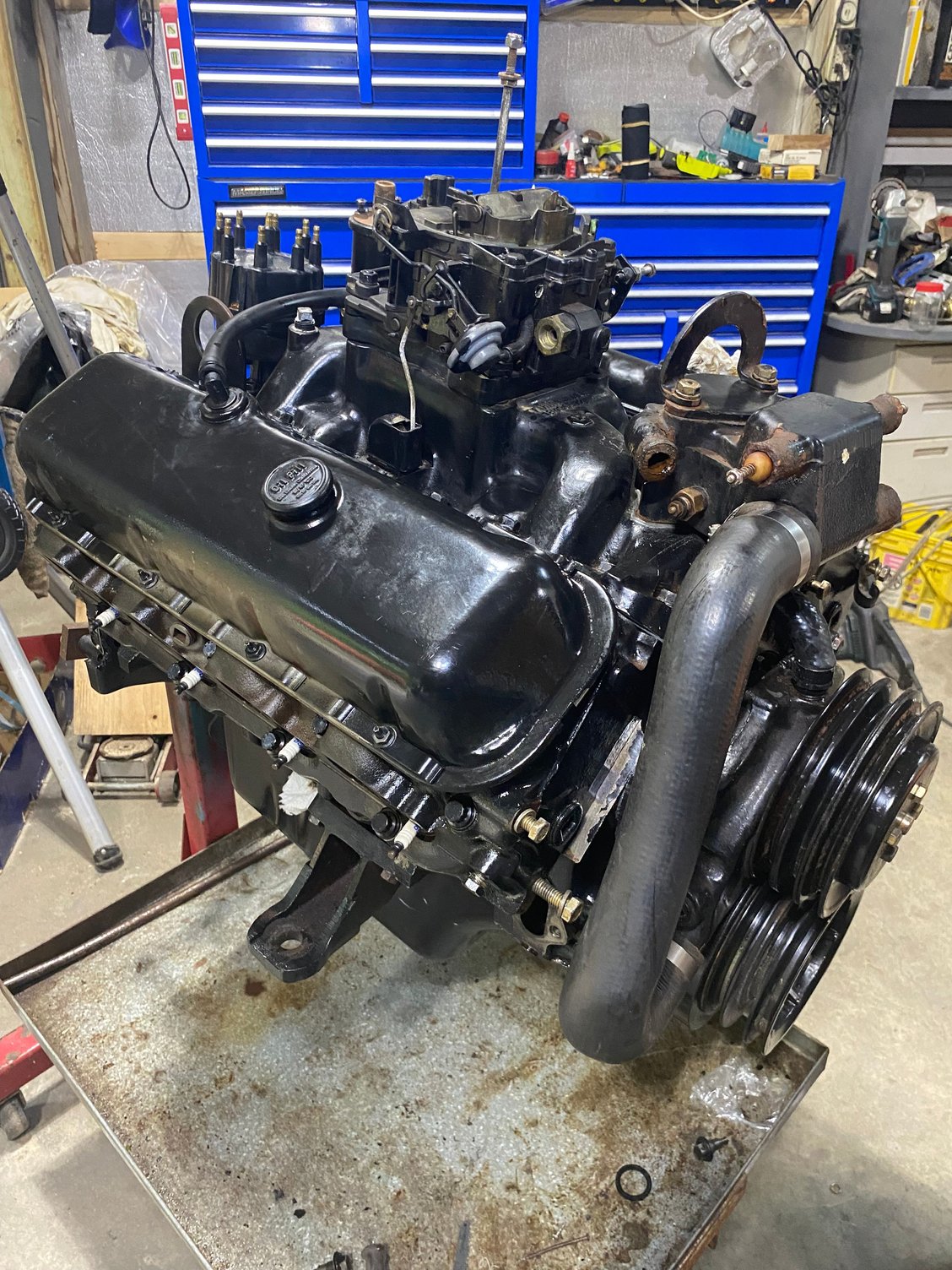 Got the motor dropped in and topped off the gas tank. Need to hook up all the electrical, accessories, exhaust and get the drives back on.