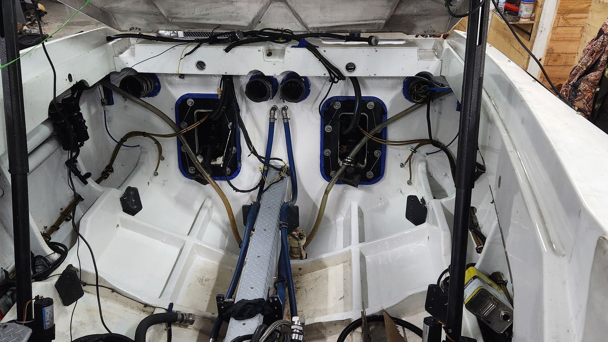 Been a busy summer with other projects, but I pulled Voodoo back into the shop this week to start prepping the bilge. Another fresh coat of bilge white, then clean up the wiring and everything we couldn't get to with the engines in there. One quart down, one to go..